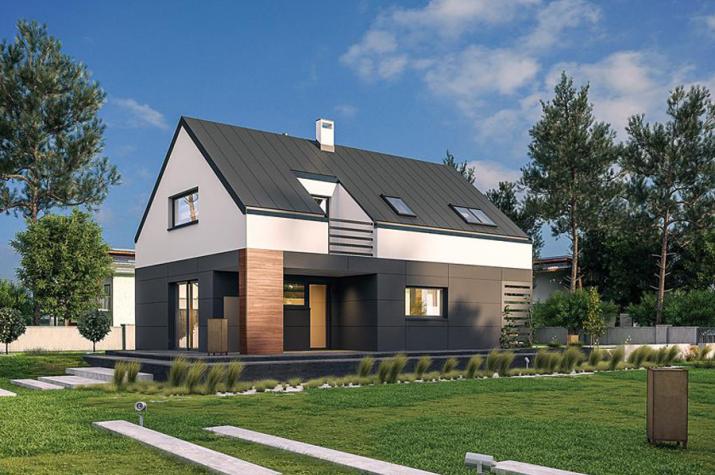 Eineinhalbgeschossiges Haus mit fünf Zimmern, Garderobe, offener Küche, Bad, Technikraum und Diele.