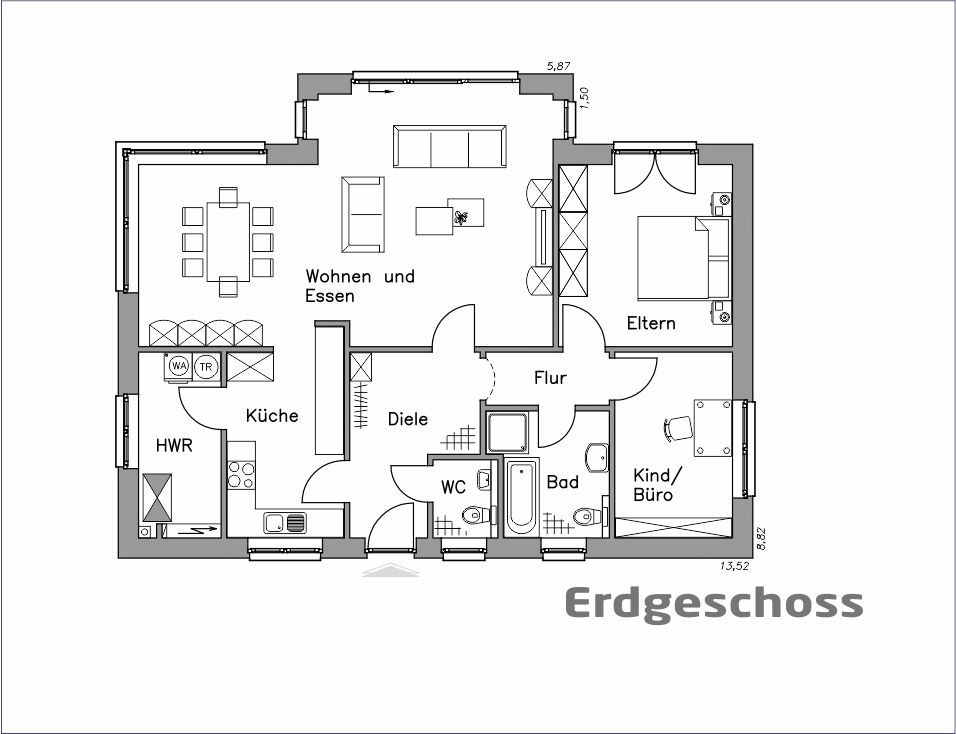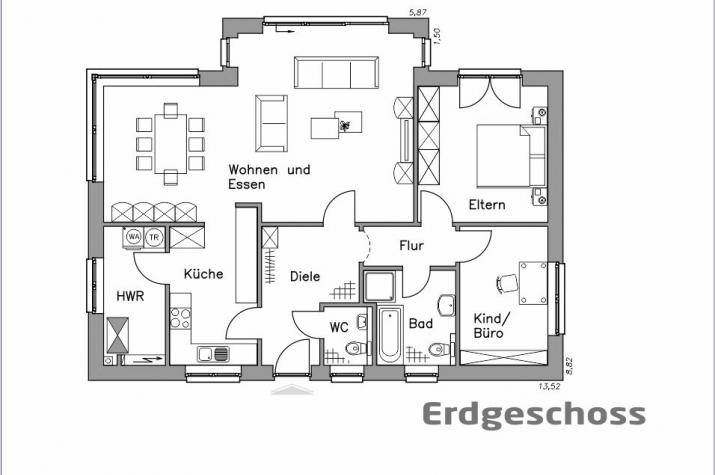 Dieser Bungalow ist auf eine 3-4 -köpfige Familie ideal zugeschnitten. Wohnen und Leben auf einer Ebene, ohne lästiges Treppensteigen! Das Raumkonzept ist klassisch perfekt und eignet sich auch für eine barrierefreie Planung. Selbstverständlich kann die Raumaufteilung Ihren Wünschen und Bedürfnissen angepasst werden. Das betrifft auch die äußere Gestaltung. Schließlich bauen Sie mit Baudirekt Ihr höchst persönliches Haus.