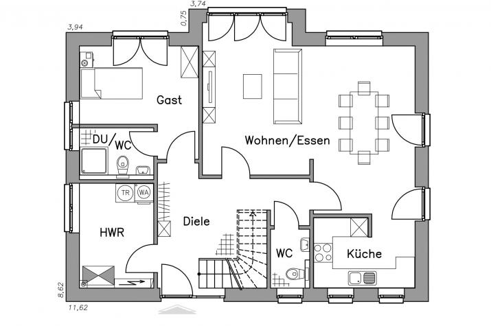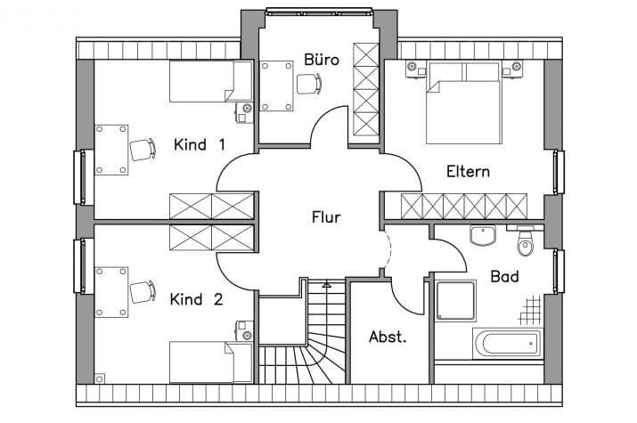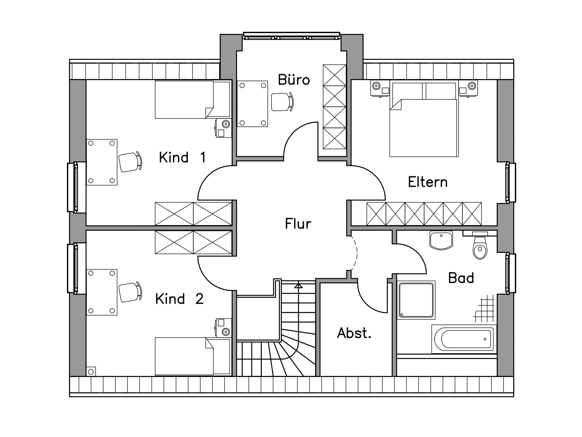 Die Baudirekt-Hausidee EH 155 bietet jedem Familienmitglied viel Platz zum Leben und Wohlfühlen. Beachten Sie im Erdgeschoss den großzügigen Wohn/Essbereich und die geräumige Küche mit dem praktisch angegliederten Hauswirtschaftsraum. Das Dachgeschoss überzeugt mit drei großen Kinderzimmern - wovon eines beispielsweise auch als Arbeitszimmer genutzt werden kann -, einem Schlafzimmer mit "Idealmaßen" und einem optimal geplanten Badezimmer. Doch nichts ist starr an dieser Hausidee - im Gegenteil: Baudirekt passt sie Ihren Wünschen und Bedürfnissen höchst persönlich an!