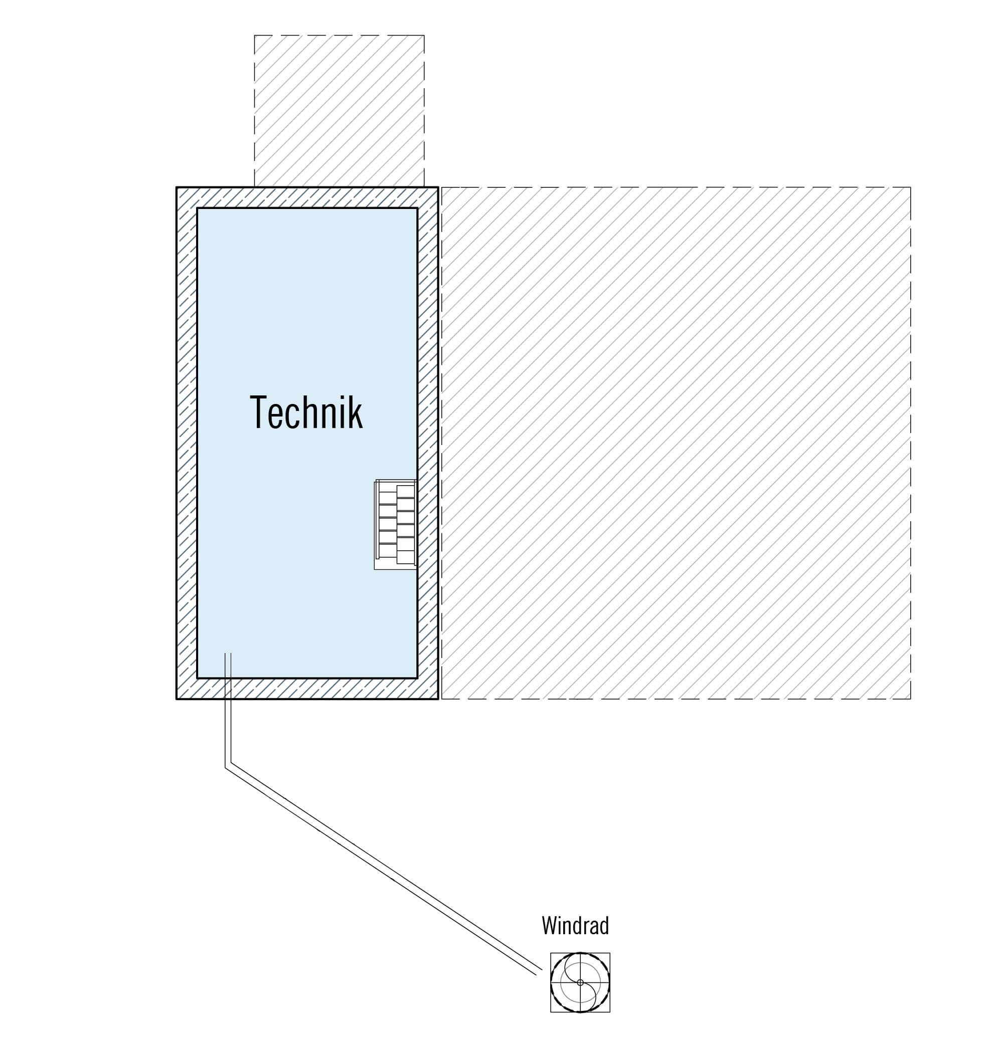 Deutlich in die Zukunft weist die Haustechnik mit einem außergewöhnlichen Energiekonzept (siehe auch Thementext „Energiekonzept“). Das Haus erzeugt einen Großteil des benötigten Stroms selbst, und zwar mittels Photovoltaikanlage, Windkraft-Turm und Brennstoffzelle. Im Vordergrund steht die möglichst hohe Eigennutzung für Warmwasserbereitung und Haushalt, plus Ladestation für Elektro-Mobile, was ein Batteriespeicher unterstützt. Verbleibende Stromüberschüsse fließen gegen Vergütung ins öffentliche Netz. Die erdgasbetriebene Brennstoffzelle übernimmt auch die Heizung des Hauses.