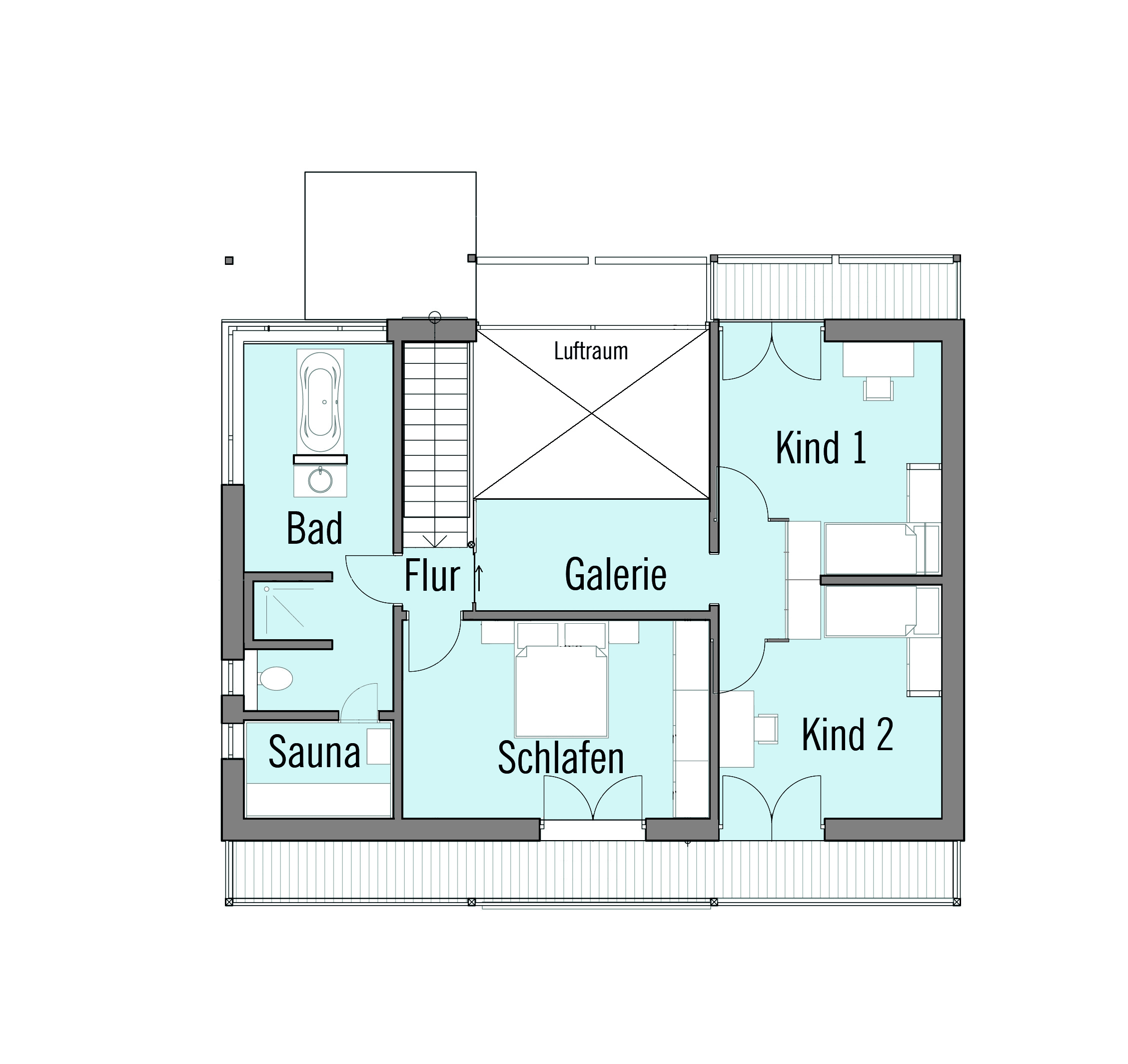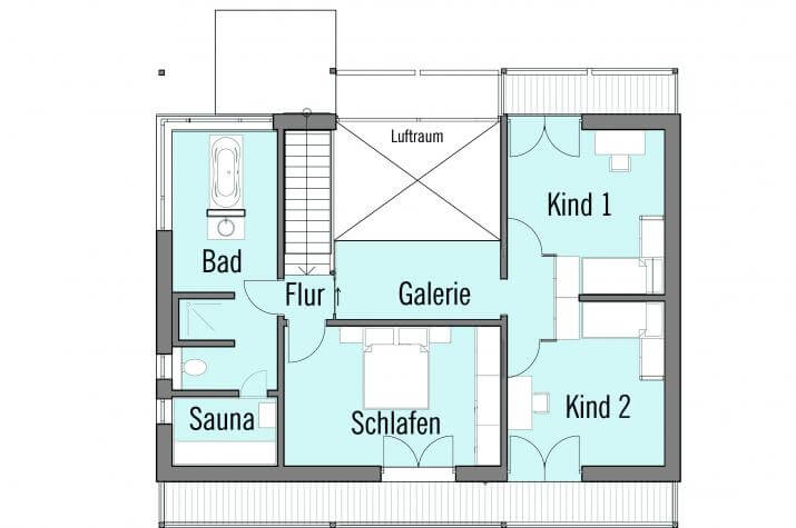 Klare Linie zeigt auch das Obergeschoss: Wellnessbad mit Baufritz-Sauna auf der einen, Elternschlaf- und zwei Kinderzimmer, die alle einen Balkonzugang besitzen, auf der anderen Seite. Die Galerielösung mit Arbeitsplatz verbindet beide Wohnebenen durch eine vertikale Sichtachse, und schenkt dem Essplatz luftige Höhe; Stichwort mehrgeschossiger, offener „Stadel“ früherer Tage.