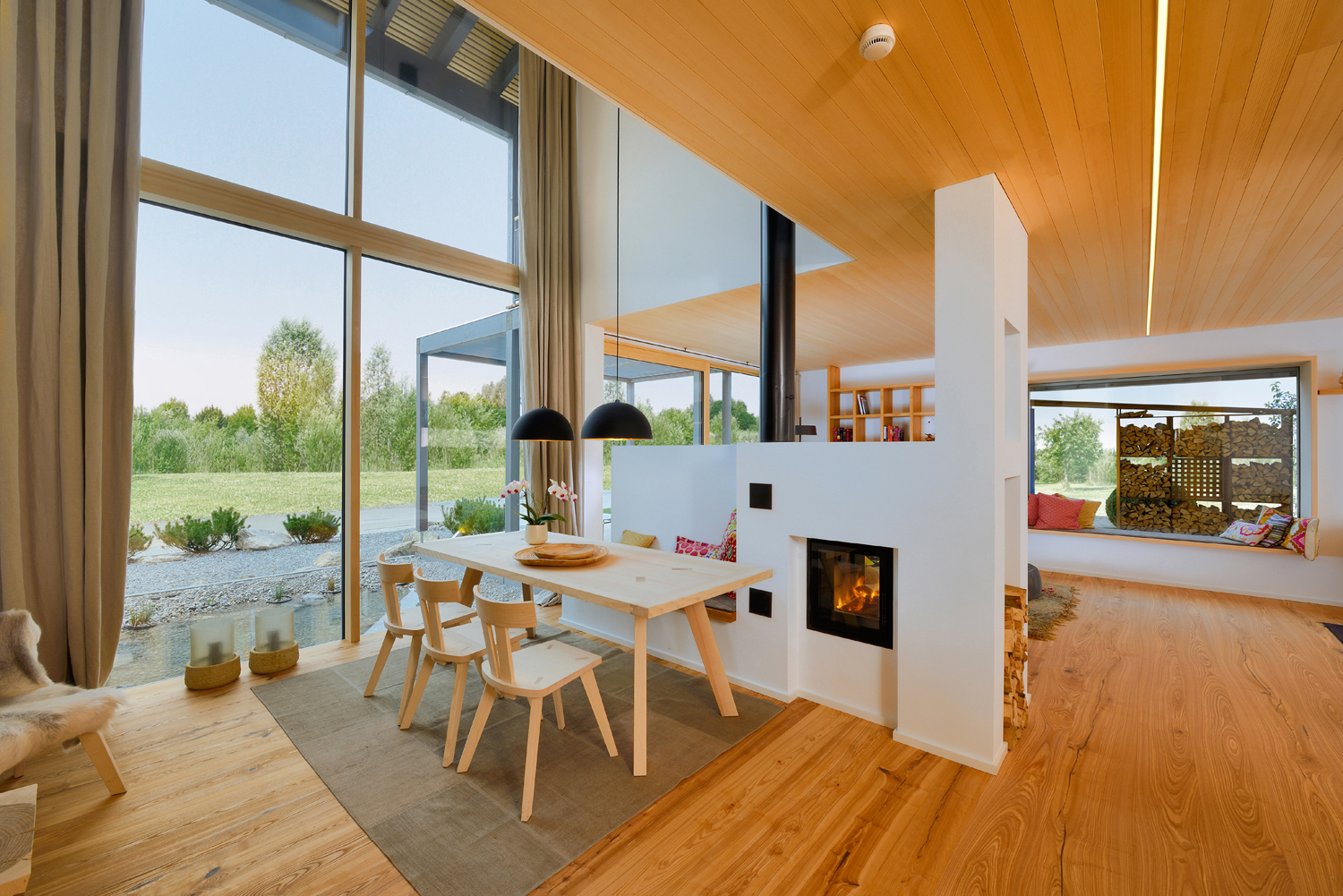 Man betritt das luxuriöse Einfamilienhaus durch ein, vor der Fassade platziertes Eingangsmodul. Vom Eingangsbereich aus gelangt man direkt zum Gäste-WC, der Garderobe und dem anschließenden Arbeitszimmer. Danach öffnet sich der großzügig bemessene, lichtdurchflutete Koch-Ess-Wohnbereich. Als “urgemütlich und natürlich edel“ beschreibt Innenarchitekt Richard Storz das Ambiente. Es lebt von der Kombination Naturstein (Böden), Eschen- und Tannenholz (Böden/Wände/Decken/ Möbel) sowie dunklem Stahl (Treppe, Möbel) mit einer sehr modernen Einrichtung; eine harmonische Spannung aus heimischen, teils groben Materialien und glatten Oberflächen.