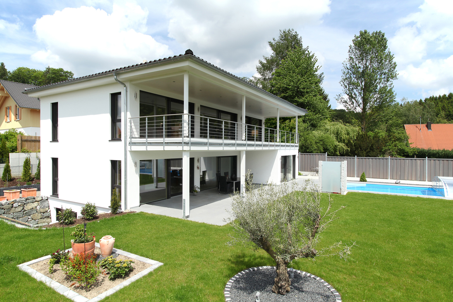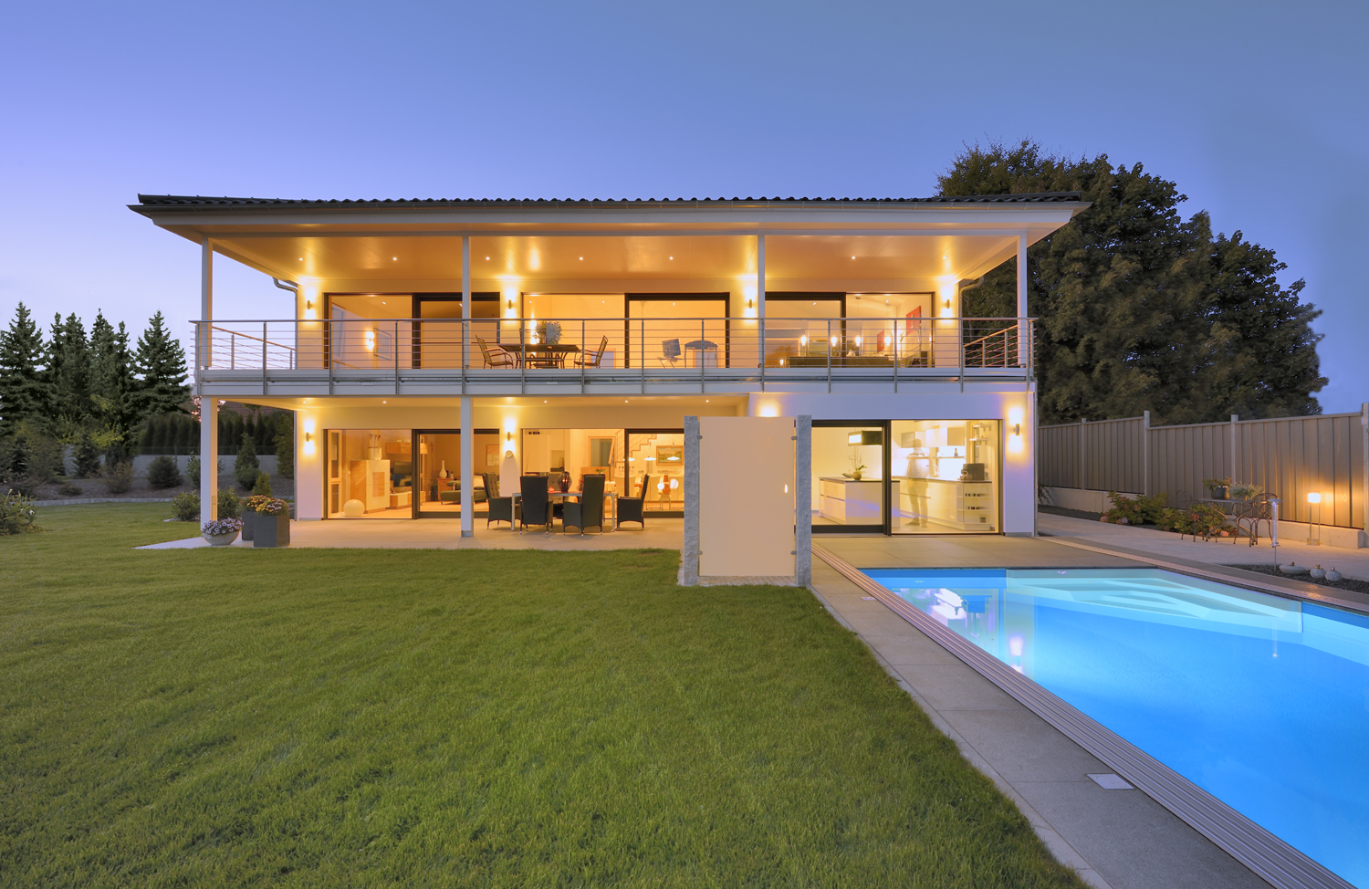 Großzügiger, überdachter Balkon und Terrasse zur Gartenseite - Privater Zugang zum Haus über die Tiefgarage (UG), welche dem Haus vorgelagert ist, ein "Tunnel" führt in den Keller unter dem Haus, durch welchen man in EG gelangt - Poolanlage im Garten - vorwiegend raumhohe Festverglasungen, Fenstertüren oder Hebe-Schiebe-Türen - Dachuntersicht: Lasierte Kalziumsilikat-Platten mit Baufritz-LED-Beleuchtung - Einstöckiger Anbau im EG