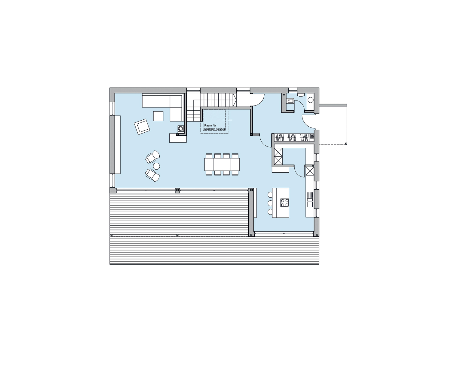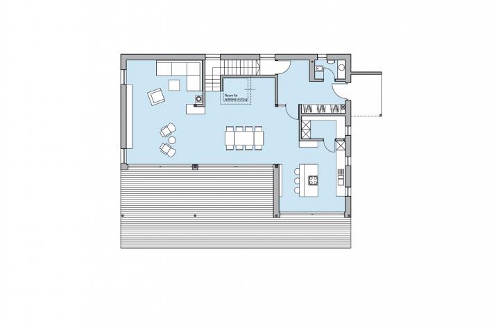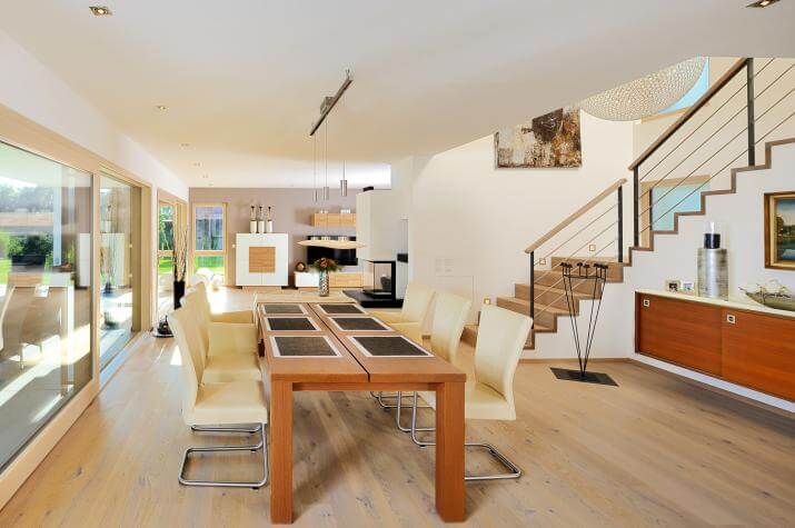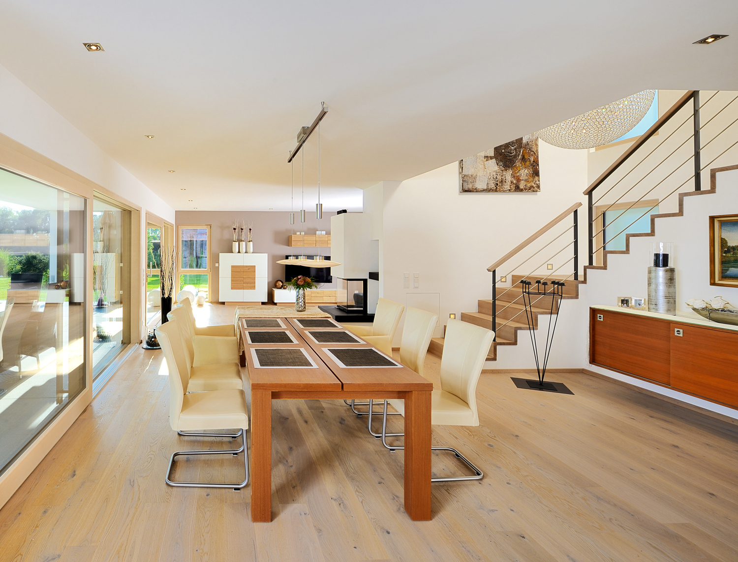 Der zweite Hauseingang liegt an der östlichen Giebelseite. Das über 100 Quadratmeter große, lichtdurchflutete Erdgeschoss nimmt die Bereiche Wohnen, Essen und Kochen auf. Dabei sind sie so weit voneinander entfernt, dass sich die Familienmitglieder bei unterschiedlichen Tätigkeiten nicht stören. Für ein gesundes Raumklima sorgt die ökologische Dämmung aus Holzspänen, die entweder bei der Produktion anfallen oder aus kontrolliertem FSC-zertifiziertem Holzanbau stammen. Zum Gesundheitskonzept gehören lösemittelfreie Innenwandfarben. Fenster und Türen lieferte der Bauherr selbstverständlich selbst. Baufritz baute sie dann so passgenau ein, dass keine gesundheitsgefährdenden PU-Bauschäume und Kleber zum Einsatz kamen.