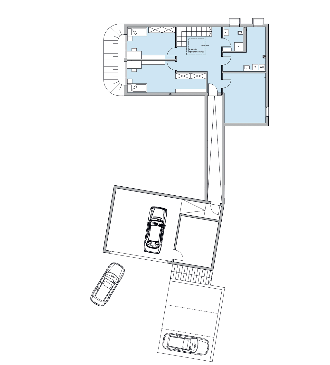 Der Neubau musste drei wesentliche Eckpunkte erfüllen: er sollte behindertengerecht und wartungsarm sein und Platz für mehrere Fahrzeuge bieten. Alle Familien-mitglieder sind auf das Auto angewiesen – die Kinder, längst erwachsen. Nach intensiven Gesprächen und herausragender Planungsleistung stand der ungewöhnliche Entwurf: