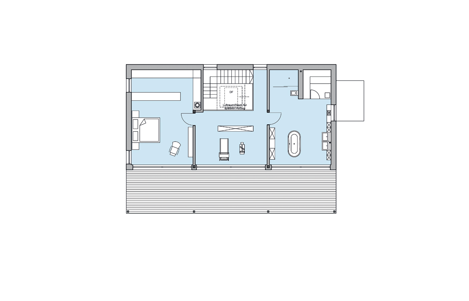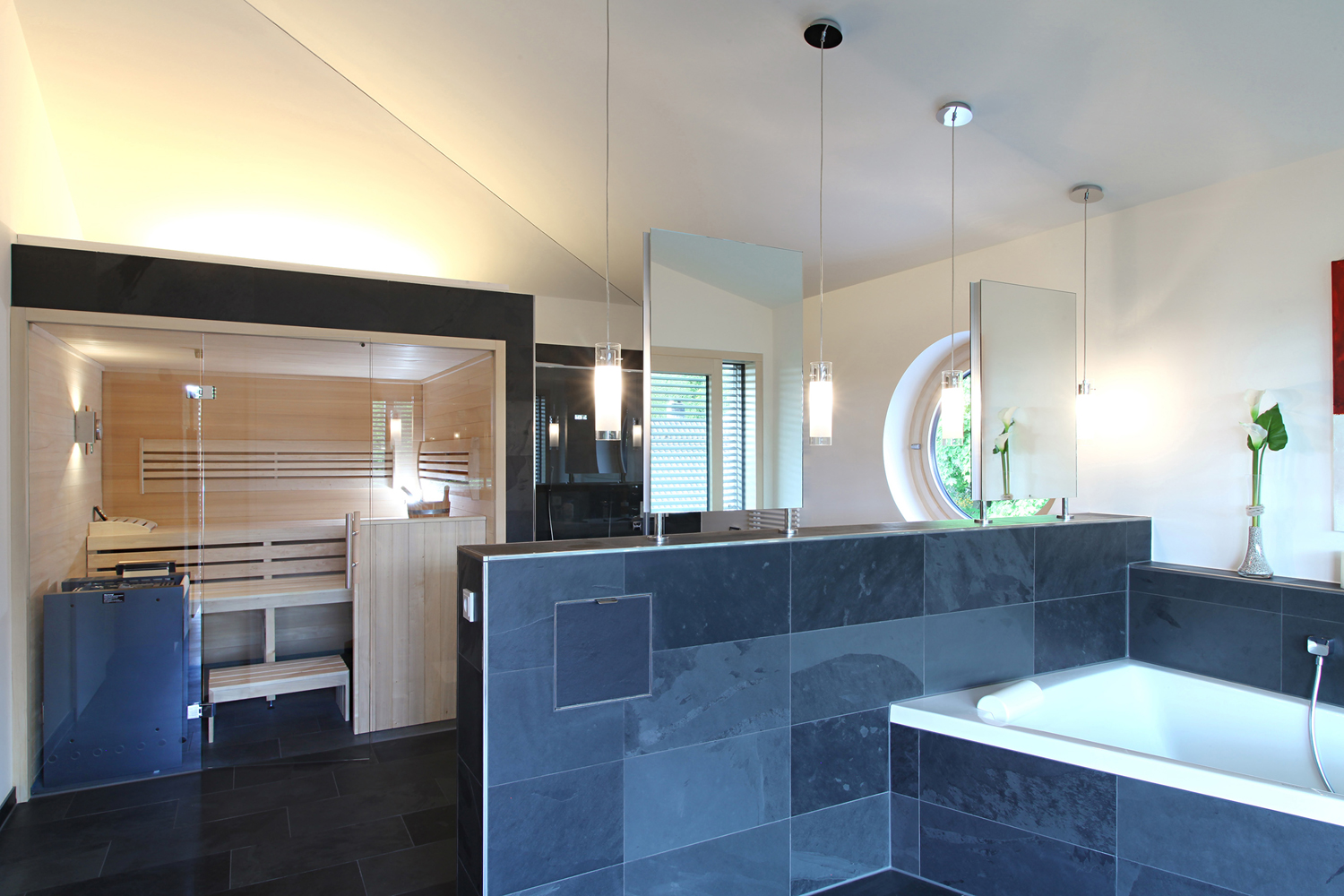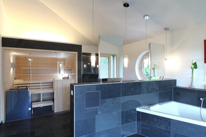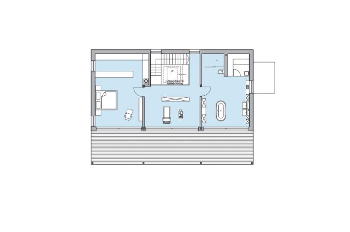 Im Oberschoss liegen das Schlafzimmer mit Ankleide, die Galerie und ein Wellness-Badezimmer mit freistehender Wanne, eine Glasdusche und Baufritz-Sauna. Hebe-Schiebtüren auf der kompletten Hausbreite öffnen das luxuriöse Domizil des Paares zum über 40 Quadratmeter großen Balkon mit unverbaubarem Blick.