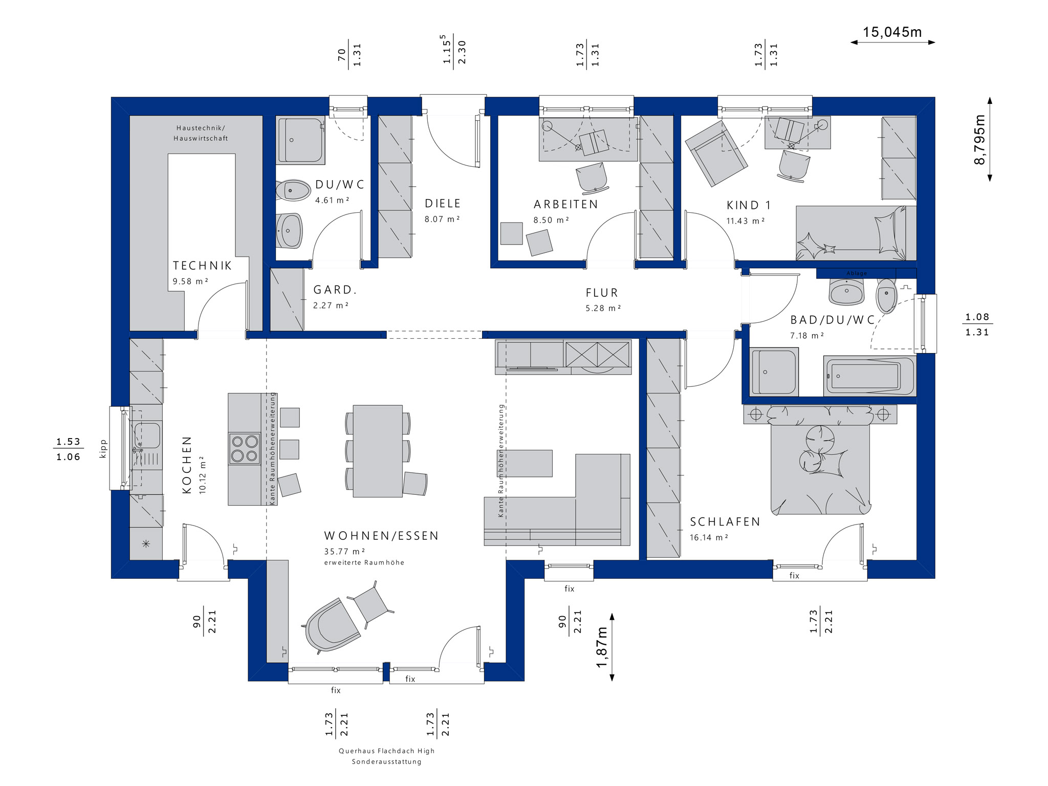 Alle Grundrissvarianten des AMBIENCE 111 funktionieren ohne Keller. Optional kann allerdings mit einem Untergeschoss Raum für das eigene Hobby oder zusätzlicher Wohn- bzw. Stauraum geschaffen werden. Wird der Technikraum des Bungalows im Untergeschoss platziert, entsteht im Erdgeschoss ein zusätzlicher Abstellraum.