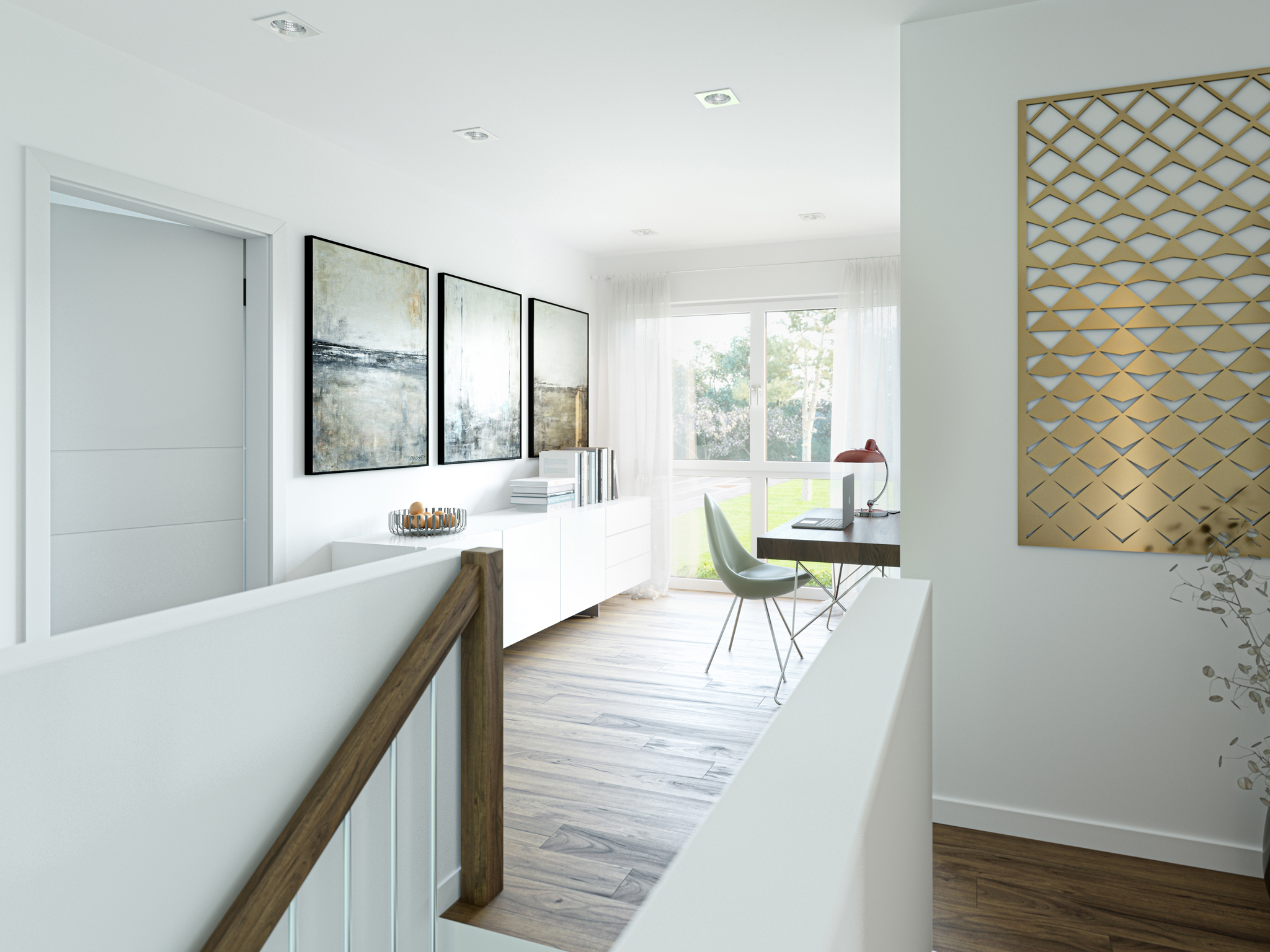 Das EDITION 134 besticht durch sein klares Grundrisskonzept. Im Erdgeschoss ist die Küche klar vom Ess- und Wohnbereich absetzt. Der Hauseingang – wahlweise auf der Trauf- oder Giebelseite – führt in einen großzügigen Dielenbereich mit Zugang zu Gäste-WC und Technikraum. Außerdem schließt sich hier, ganz nach Bedarf, ein Arbeitszimmer oder ein Windfang mit angrenzender Speisekammer an. In beiden Fällen führt direkt aus der Diele eine schicke, geradläufige Treppe nach oben. Dort erschließt eine gemütliche Empore das Elternschlafzimmer und die beiden Kinderzimmer sowie das große Familienbad. Im EDITION 134 spiegeln sich die Erfahrung von mehr als 110 Jahren und die gesamte Hausbau-Kompetenz von Bien-Zenker wider. Es lässt sich – wie alle Bien-Zenker Häuser – flexibel an Ihre individuellen Wünsche und Bedürfnisse anpassen und ist damit der ideale Mittelpunkt für Ihren neuen Lebensraum.