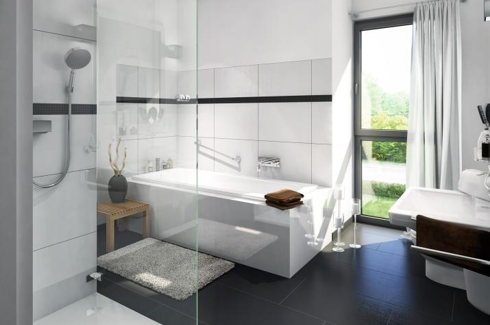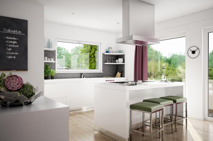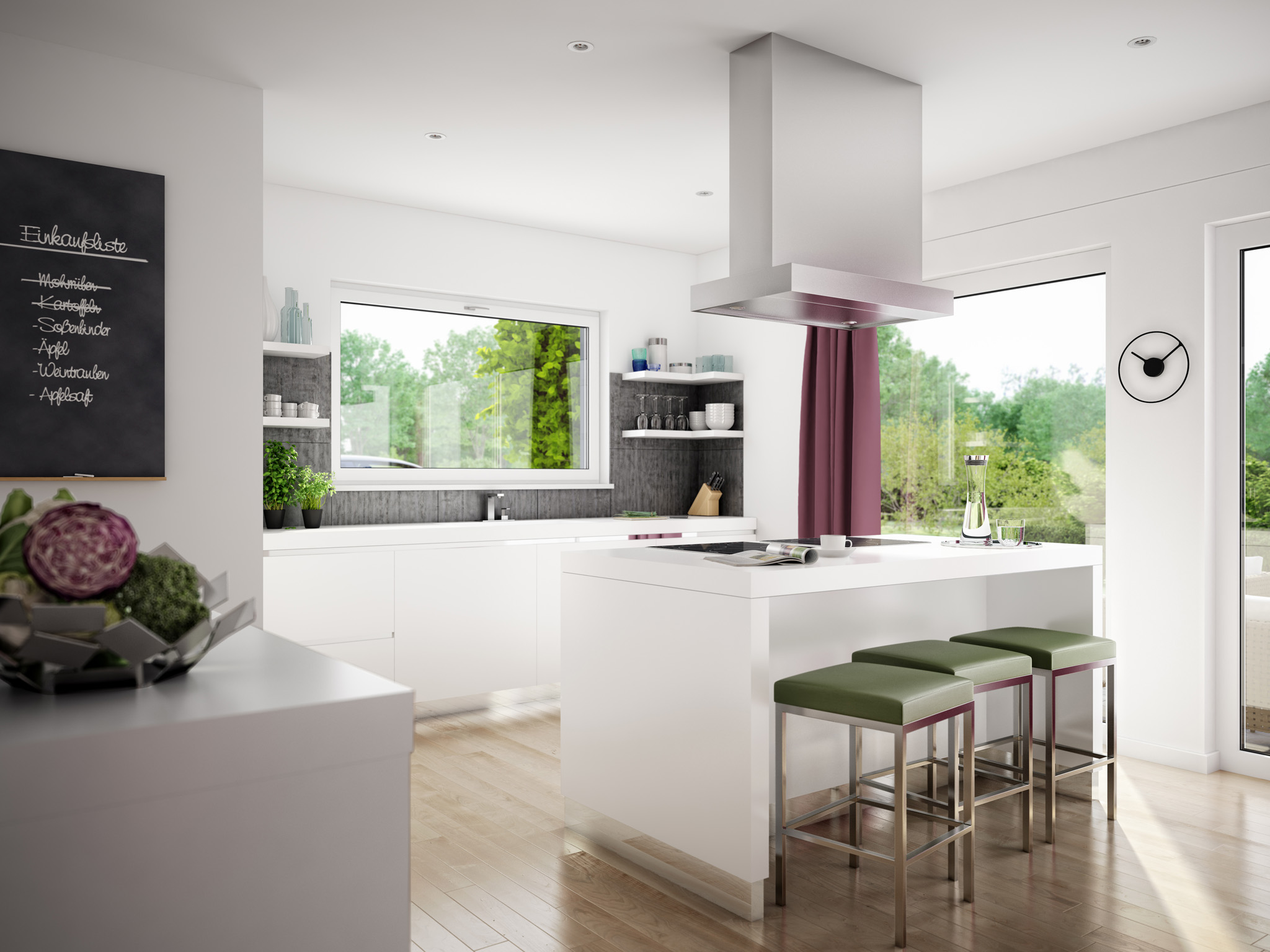 Der intelligente Grundriss bietet auf 122 m² alles für ein perfektes Wohnerlebnis. Im Erdgeschoss dient der großzügige Wohn-Essbereich mit angeschlossener Küche als Lebensmittelpunkt für die Bewohner. Dank großer Fensterflächen sind alle Räume hell und lichtdurchflutet und bieten gleichzeitig ausreichend Stellfläche zum Einrichten. Über die platzsparend integrierte Treppe, die sowohl im Erd- als auch im Obergeschoss Basis für eine intelligente Raumaufteilung ist, erschließen sich die drei Schlafzimmer und das große Wellness-Bad im Obergeschoss. Auch hier begeistern große und lichtdurchflutete Zimmer.