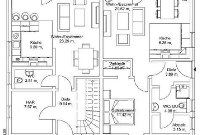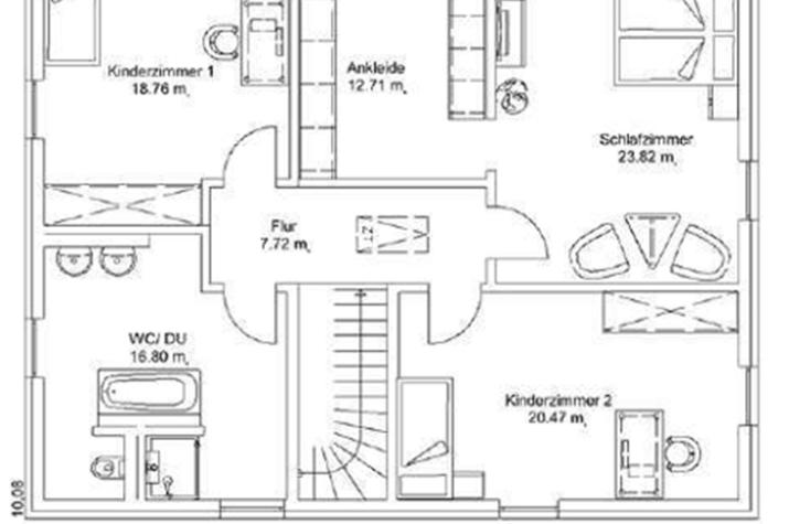 Ein gemeinsames Zuhause für Großeltern, Eltern und Kinder. Das untere Apartment schafft Gemütlichkeit für die Großeltern, während das obere mit 3 großzügigen Schlafzimmern und einer geräumigen Garderobe auf zwei Ebenen viel Platz für eine Familie mit 2 bis 3 Kindern bietet. Große Fenster ermöglichen einen direkten Zugang zum Garten. Separate Eingänge geben beiden Generationen ein hohes Maß an Unabhängigkeit und Flexibilität. Das klassische, vierseitige Dach verleiht dem Haus einen einladenden Charme.