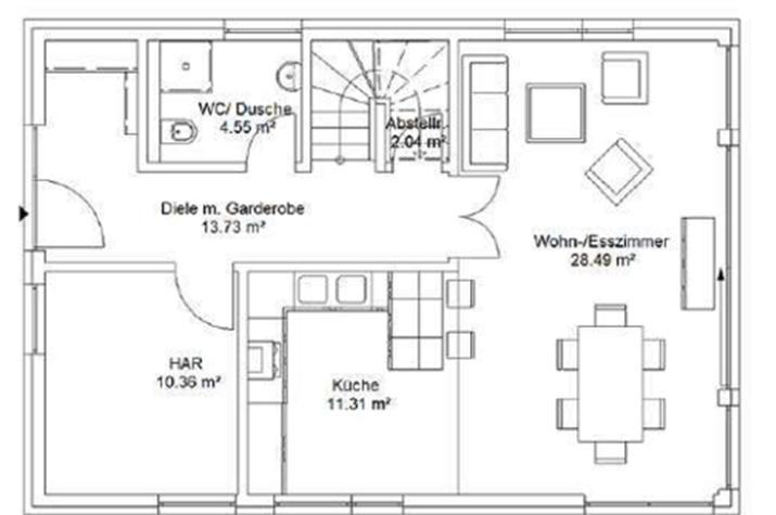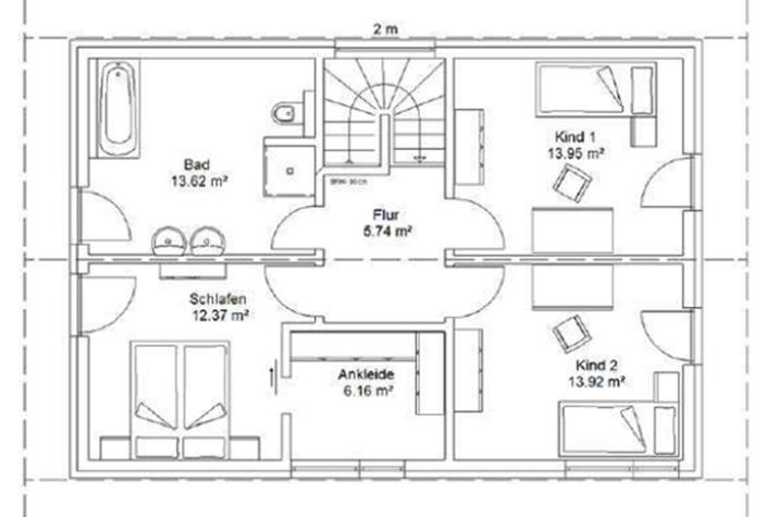In diesem Enovia-Haus kann sich die ganze Familie entfalten. Viel Platz und wenige Schrägen machen Lust darauf, sich einzurichten und ganz entspannt zu wohnen: Aus dem großzügigen Wohn- und Essbereich fällt der Blick ungehindert in den Garten. Von der offenen Küche geht noch eine zugängliche Speisekammer ab. Eine Garderobe, Gäste-WC und Hauswirtschaftsraum sind weitere Pluspunkte. Im Dachgeschoss überrascht das Elternschlafzimmer durch eine zusätzliche Sitzecke. Beide Kinderzimmer sind schön geräumig und auch das Bad hat eine komfortable Größe.