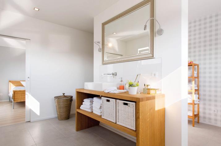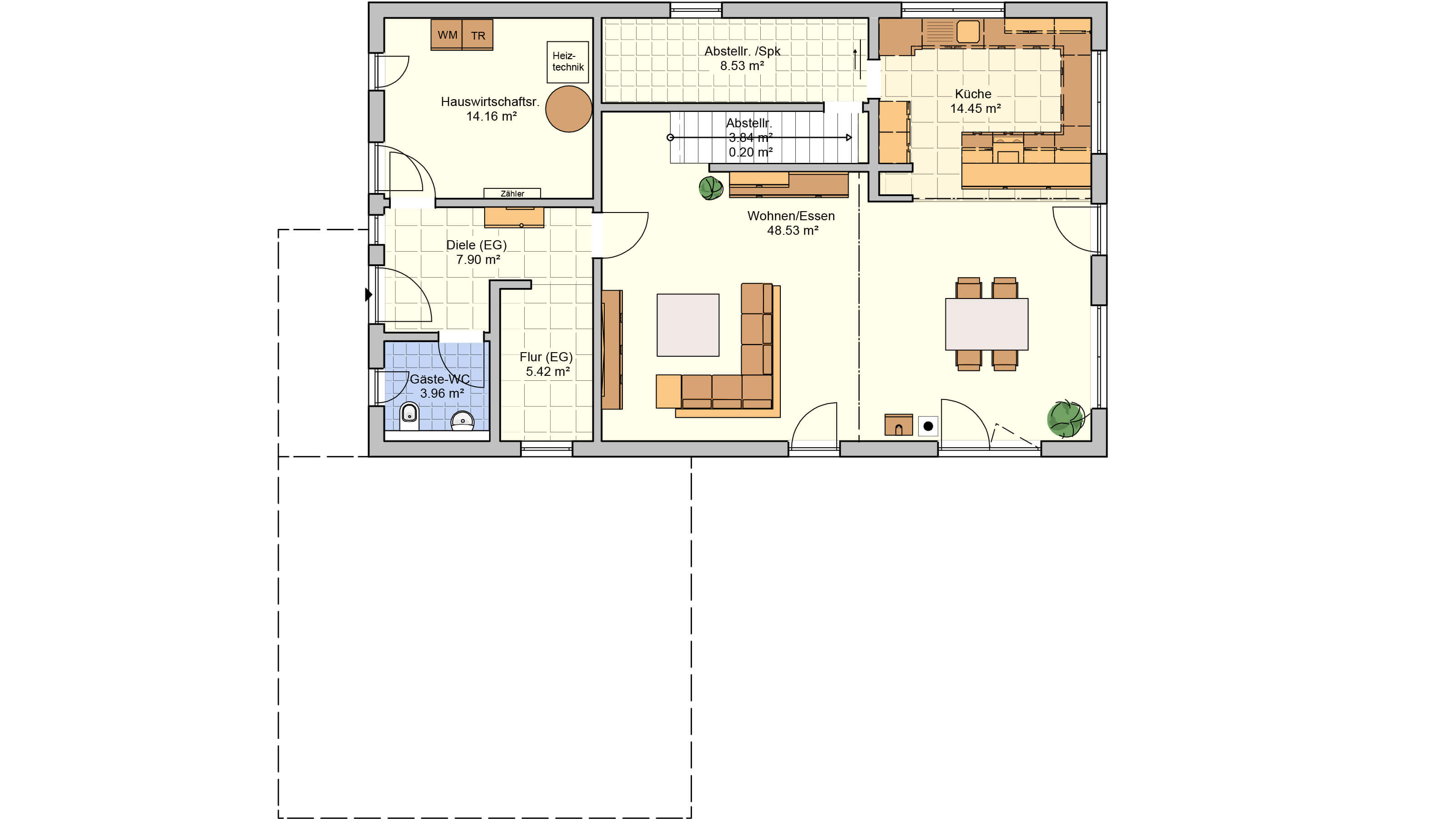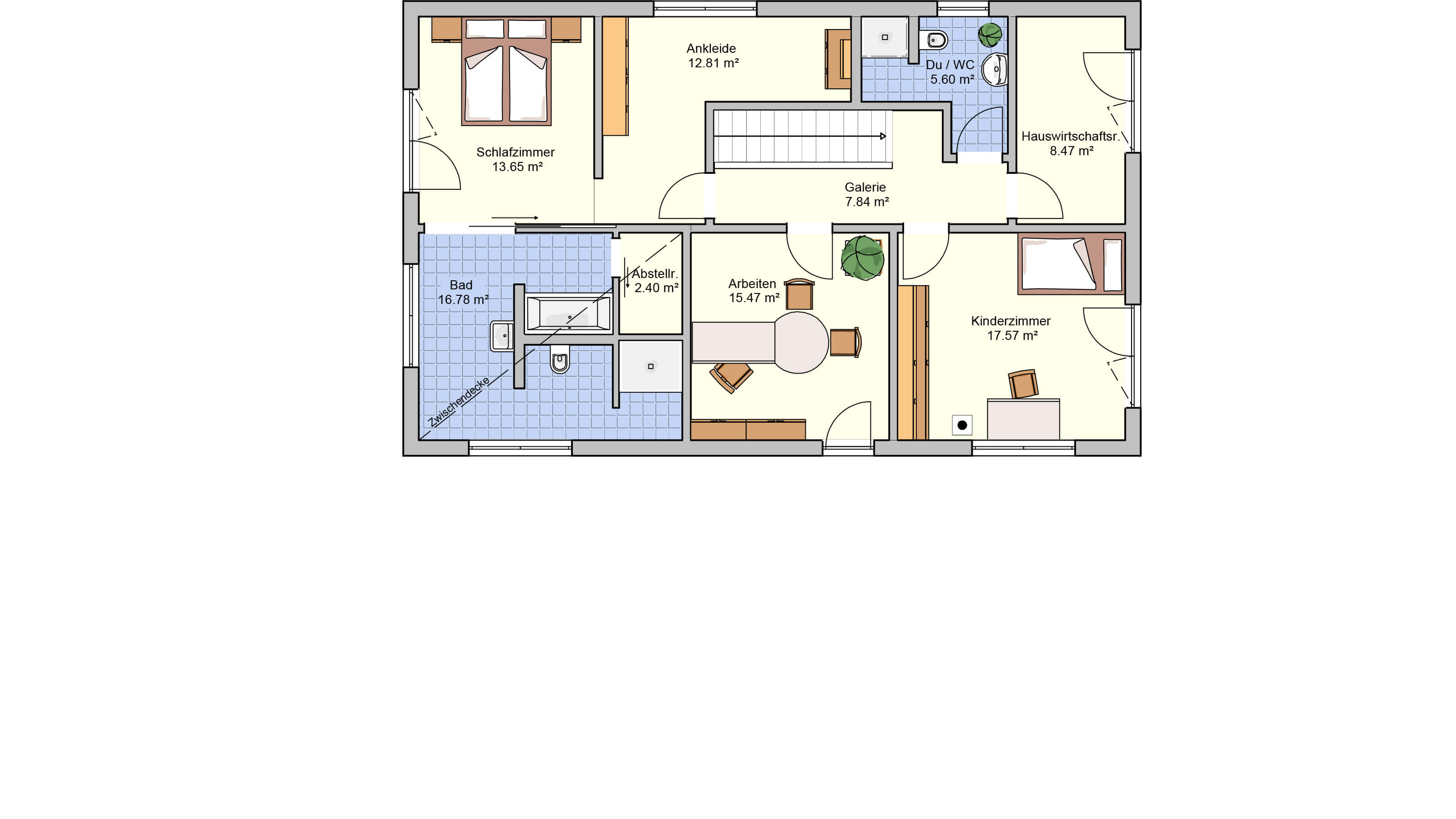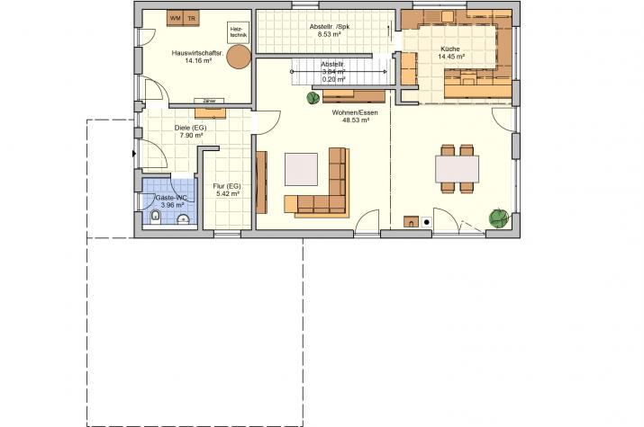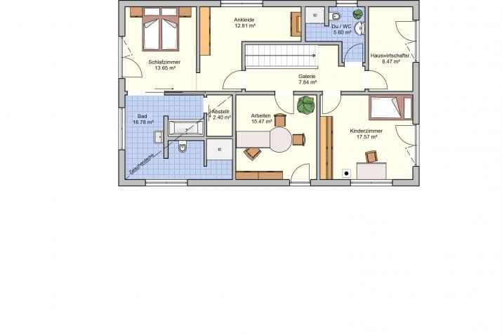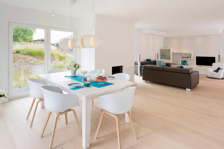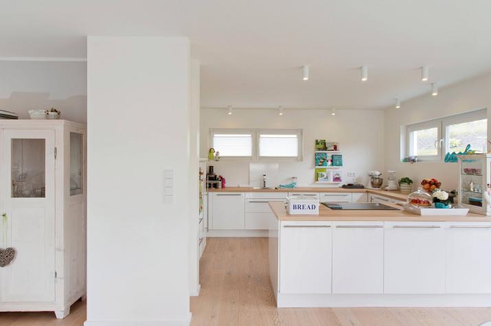 Daheim ist es am Schönsten - Der offene Wohn-, Ess- und Kochbereich charakterisieren das Haus. Hier findet sich genug Platz um das Leben gemeinsam zu genießen. Die großen Fenster und Fenstertüren sorgen für ausreichend natürlich Lichteinstrahlung und machen den Raum schön hell. Außerdem finden sich im Erdgeschoss der Hauswirtschaftsraum, sowie eine Speisekammer und ein WC. Im Dachgeschoss befindet sich ausreichend Platz für ein Arbeitszimmer (HomeOffice), ein Kinderzimmer einen Hauswirtschaftsraum ein Badezimmer und ein Schlafzimmer mit einer Ankleide und anschließendem großen Badezimmer. Der Schlaf- und Ankleidebereich wird durch eine Glasschiebetüre geschickt vom großen Wohlfühlbad getrennt. Die beiden zusätzlichen Räume können selbstverständlich auch als Gästezimmer oder Hobbyraum genutzt werden.