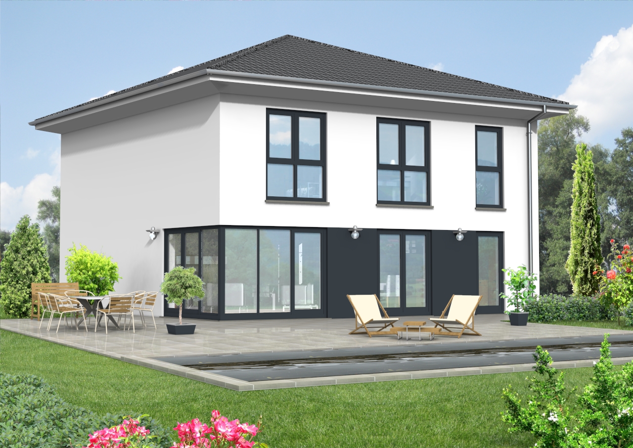 Unsere Baureihe Stadtvilla bzw. Walmdach verbindet den Charme und die Leichtigkeit der südländischen Architektur mit moderner massiver Energiesparbauweise.
