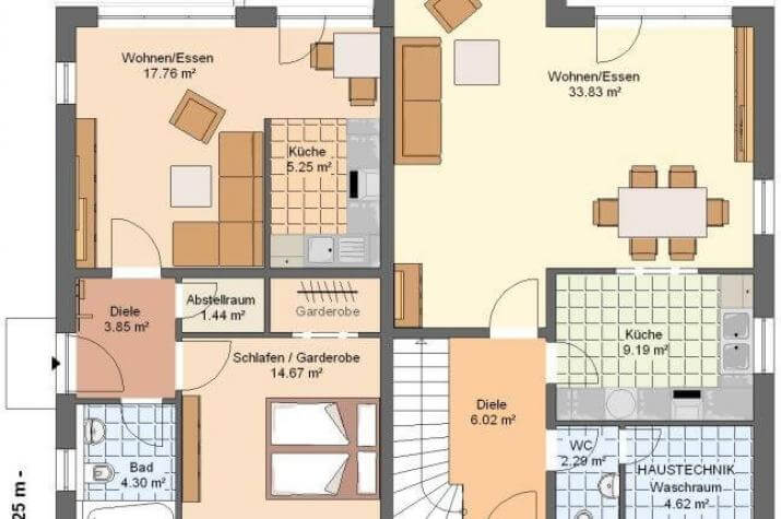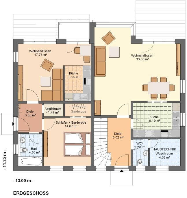 Im großen Eingangsbereich befindet sich Platz für eine große Garderobe, der Zugang zum Gäste-WC, die Küche und den Wasch- und Technikraum.