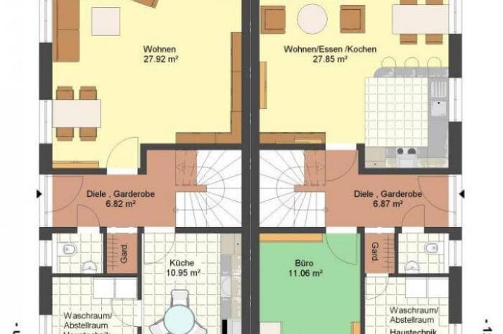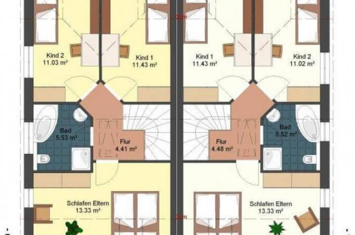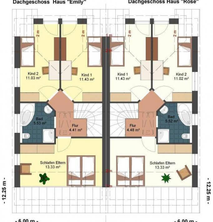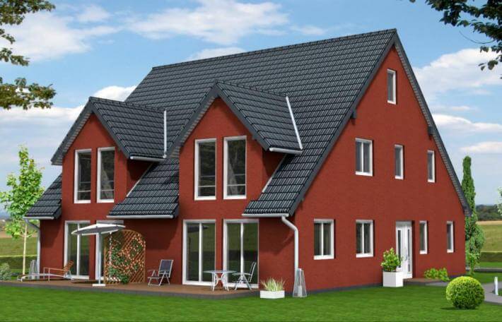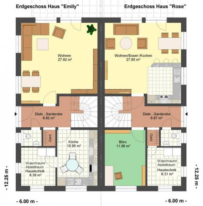 Bei einem deutlichen Preisvorteil bietet eine Doppelhaushälfte fast den gleichen Wohnkomfort wie ein Einfamilienhaus. Die hier dargestellten Doppelhaushälften Emily links und Rose rechts unterscheiden sich in puncto Zimmeranzahl.