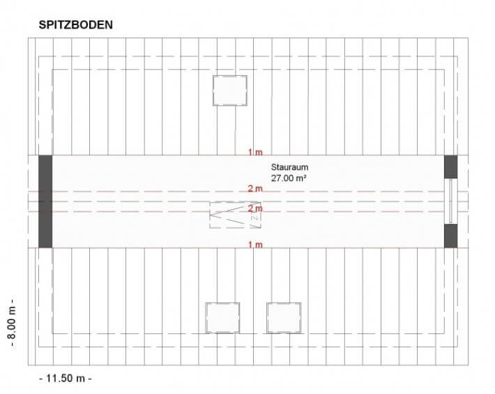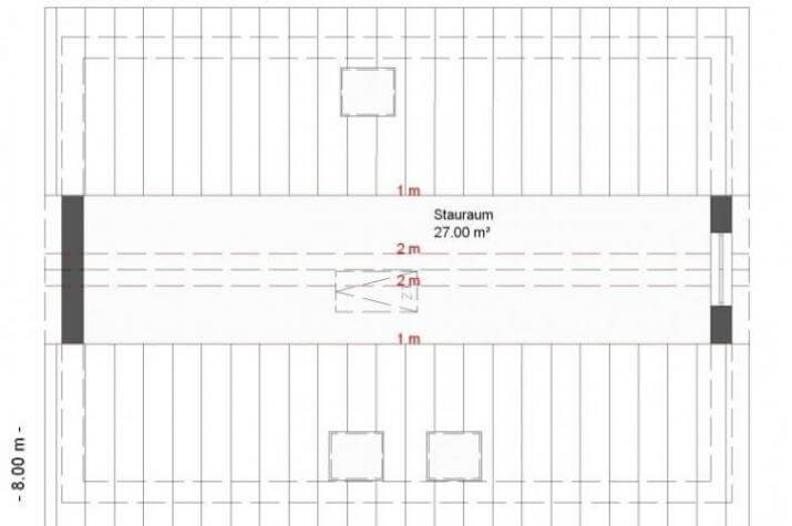Eine große Familie braucht auch mehr Abstellraum: den finden Sie direkt unter dem Dach. Im Spitzboden befindet sich ein begehbarer, ca. 27m² großer Stauraum mit Fenster.