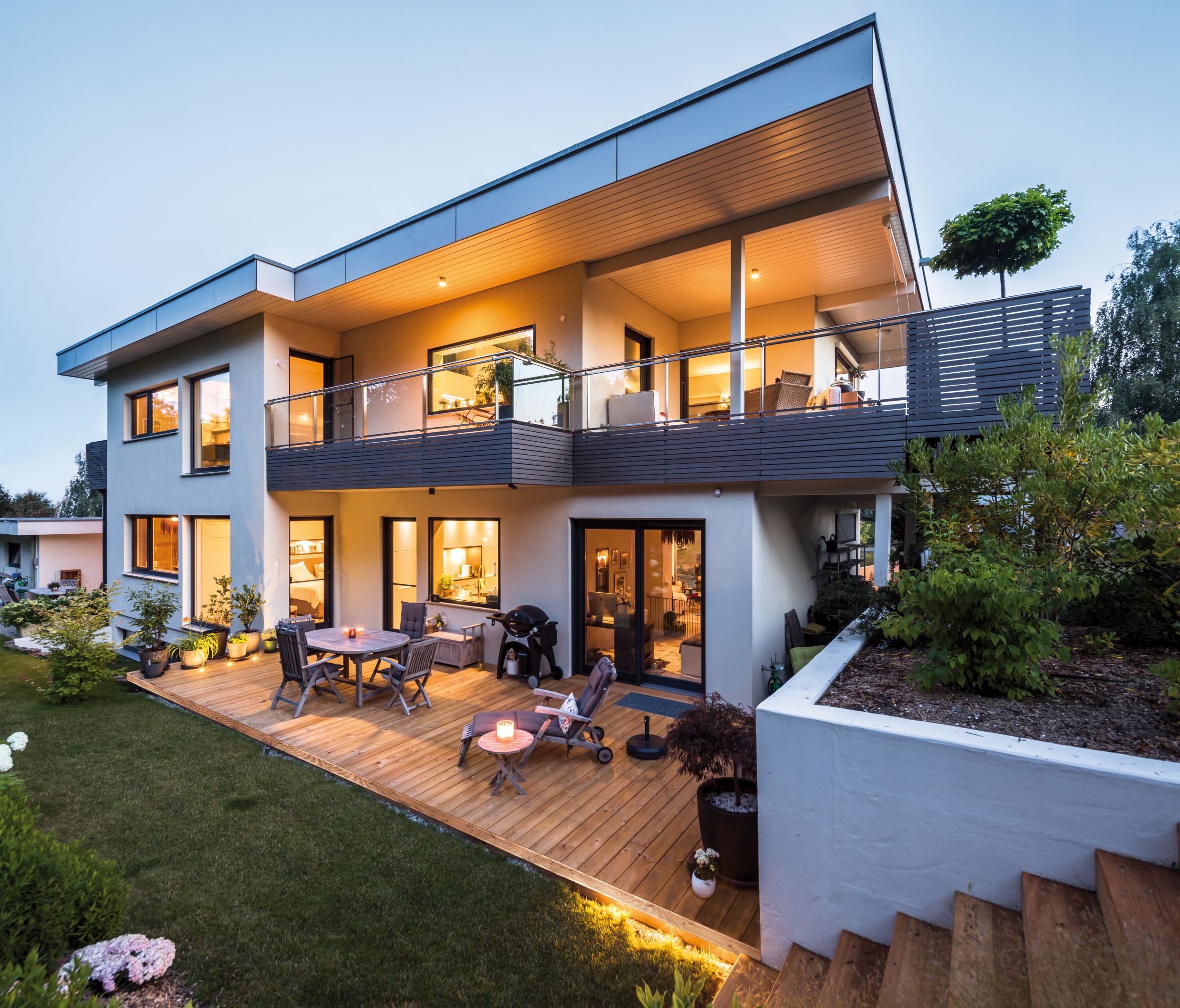 Das Flachdach wird besonders betont durch eindrucksvolle Auskragungen. Sie überspannen die umlaufenden Balkone schützend –dieselbe Aufgabe übernehmen die Balkone zum Teil für die Terrassen im EG. Das prägt den Baukörper enorm, unterstützt in aller Deutlichkeit das Design und bietet gleichzeitig Funktionalität.