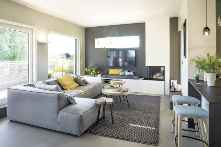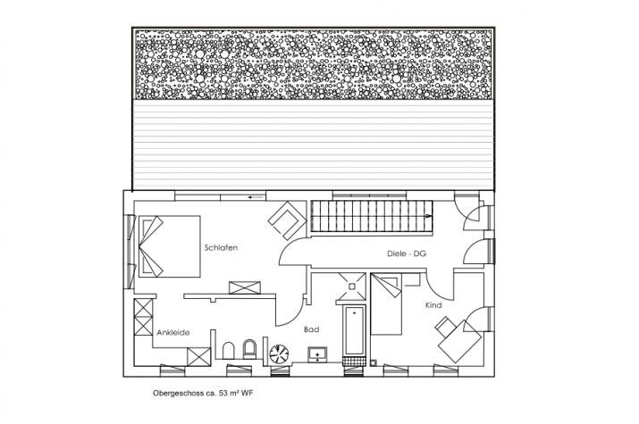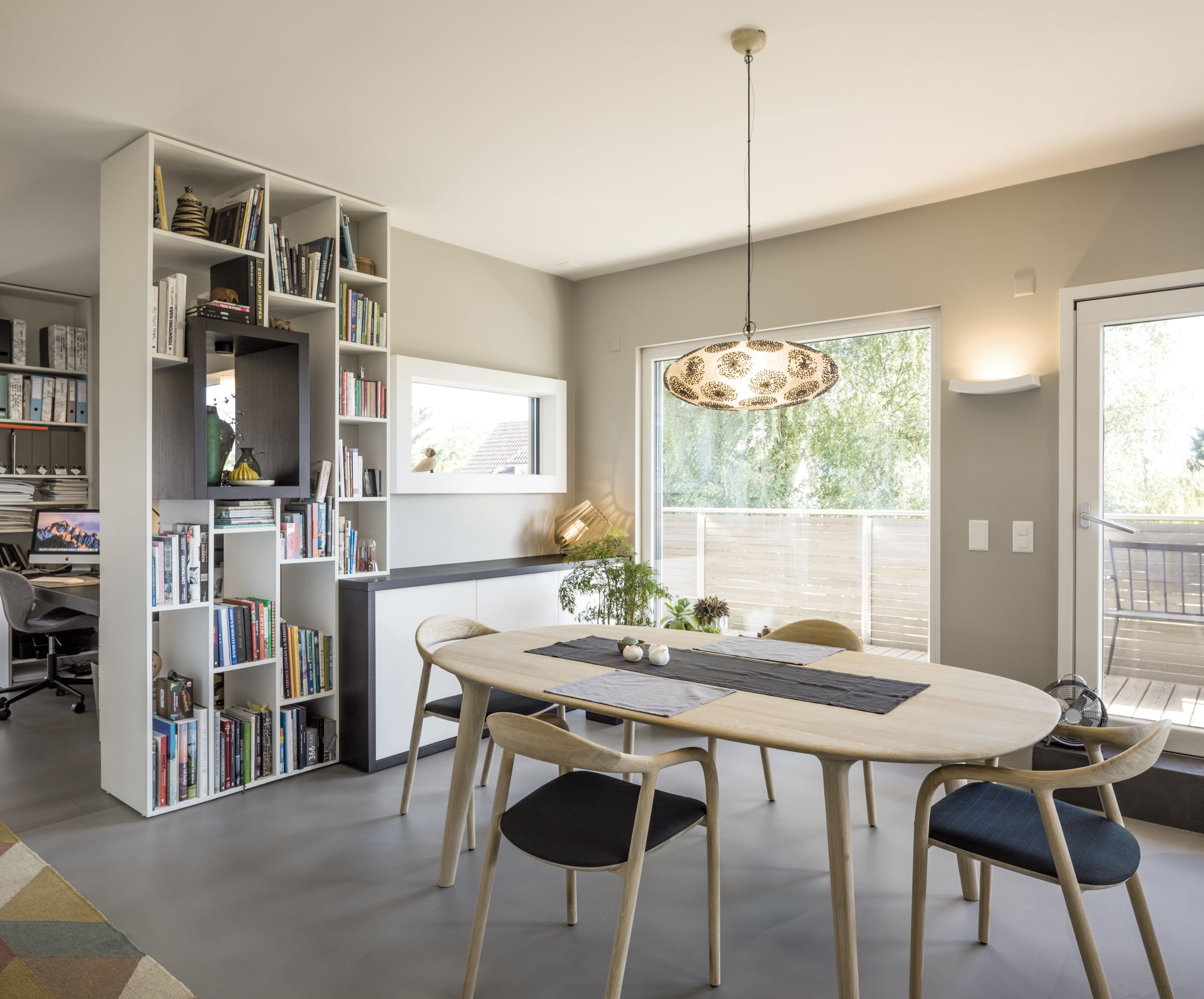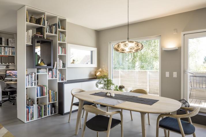 Dass in Regnauer Vitalhäusern Gestaltung und Funktionenvielfalt immer eine gelungene Einheit bilden, macht auch die Grundrissgliederung von Haus Fabienne deutlich: Es beherbergt in seinen vorderen Bereichen im EG und OG die Badezimmer, die jeweils sowohl von der Diele als auch vom Schlafzimmer zu erreichen sind. In den hinteren Bereichen findet das Leben statt. Dabei schafft der langgestreckte Baukörper in allen Räumen attraktive Fenster- und Lichtsituationen.