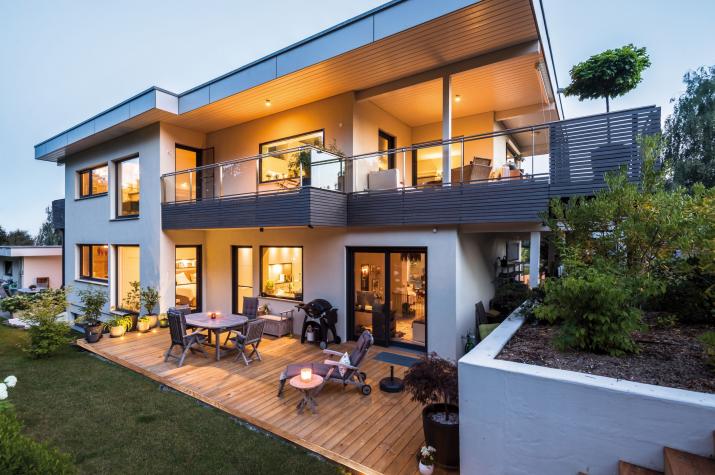 Als zwei in sich geschlossene und voneinander unabhängige Wohneinheiten ausgelegt, verbinden die Balkone, Außentreppen und Terrassen die beiden Geschosse zu einem wahrhaft idyllischen Zuhause für mehrere Generationen.