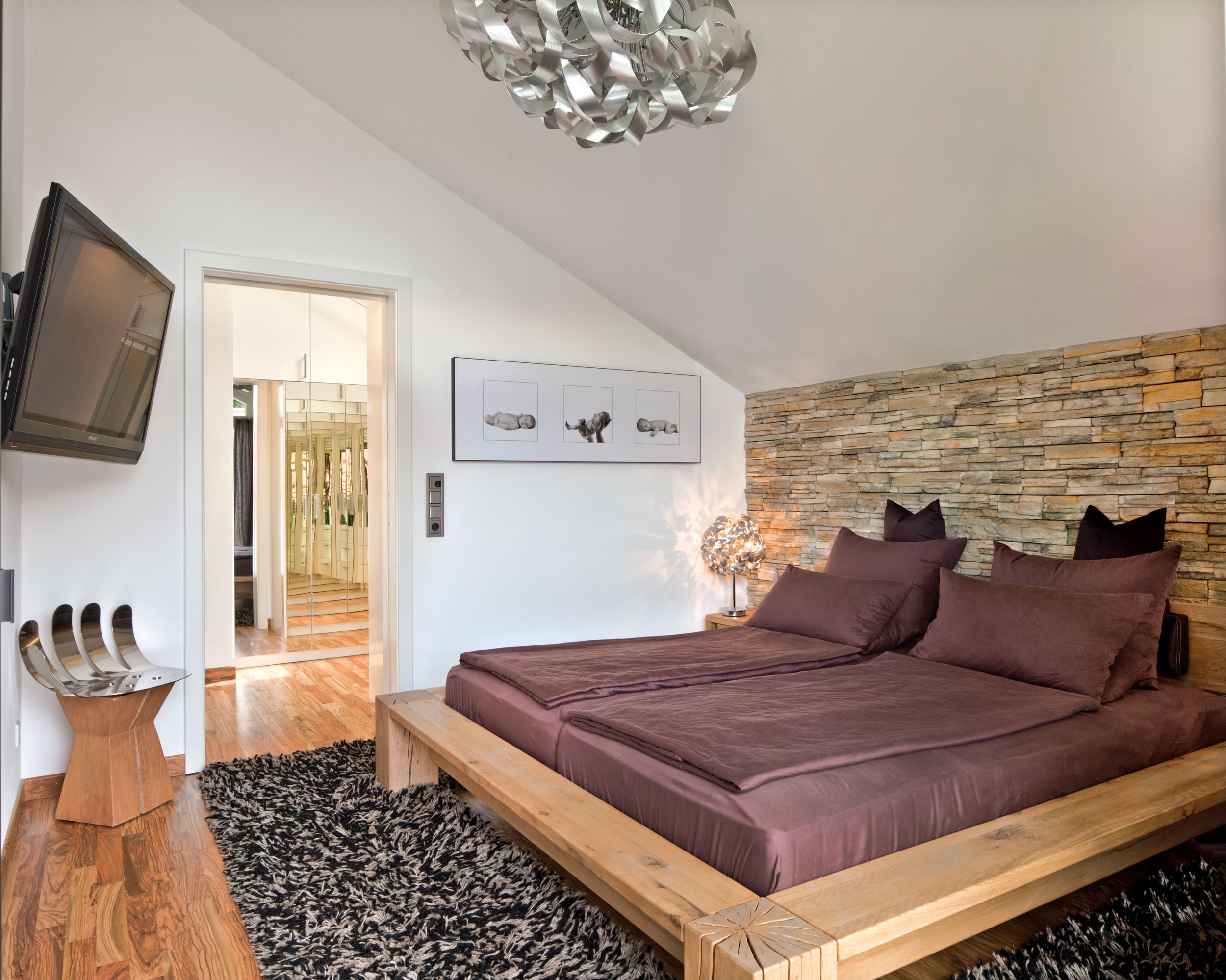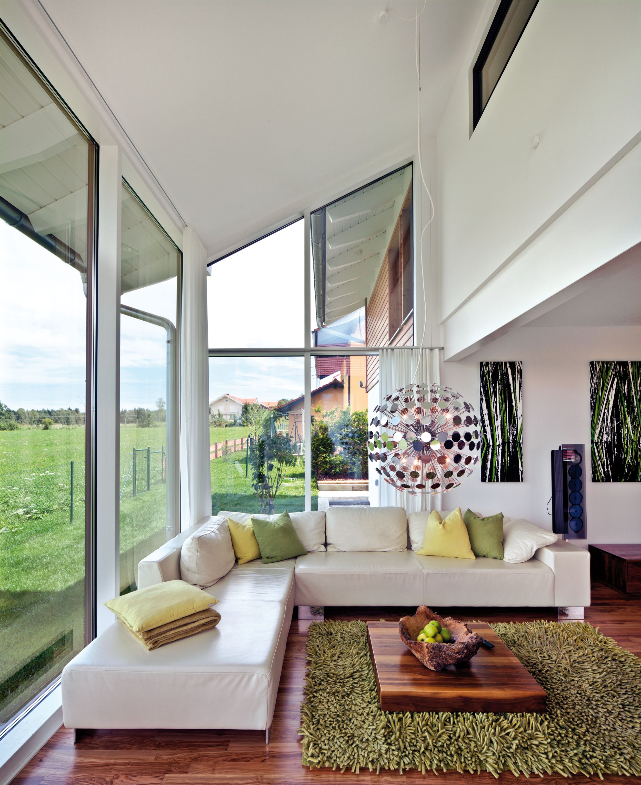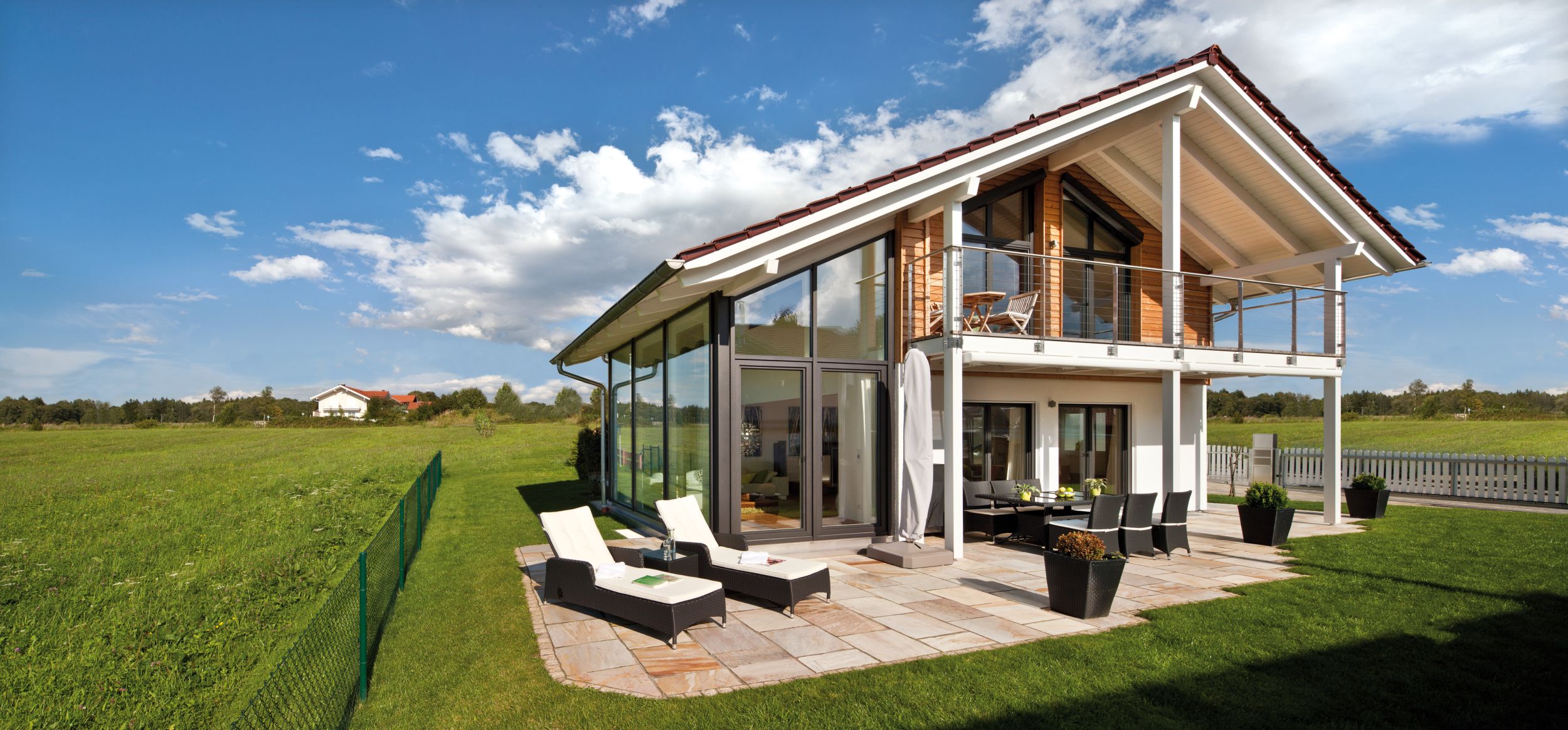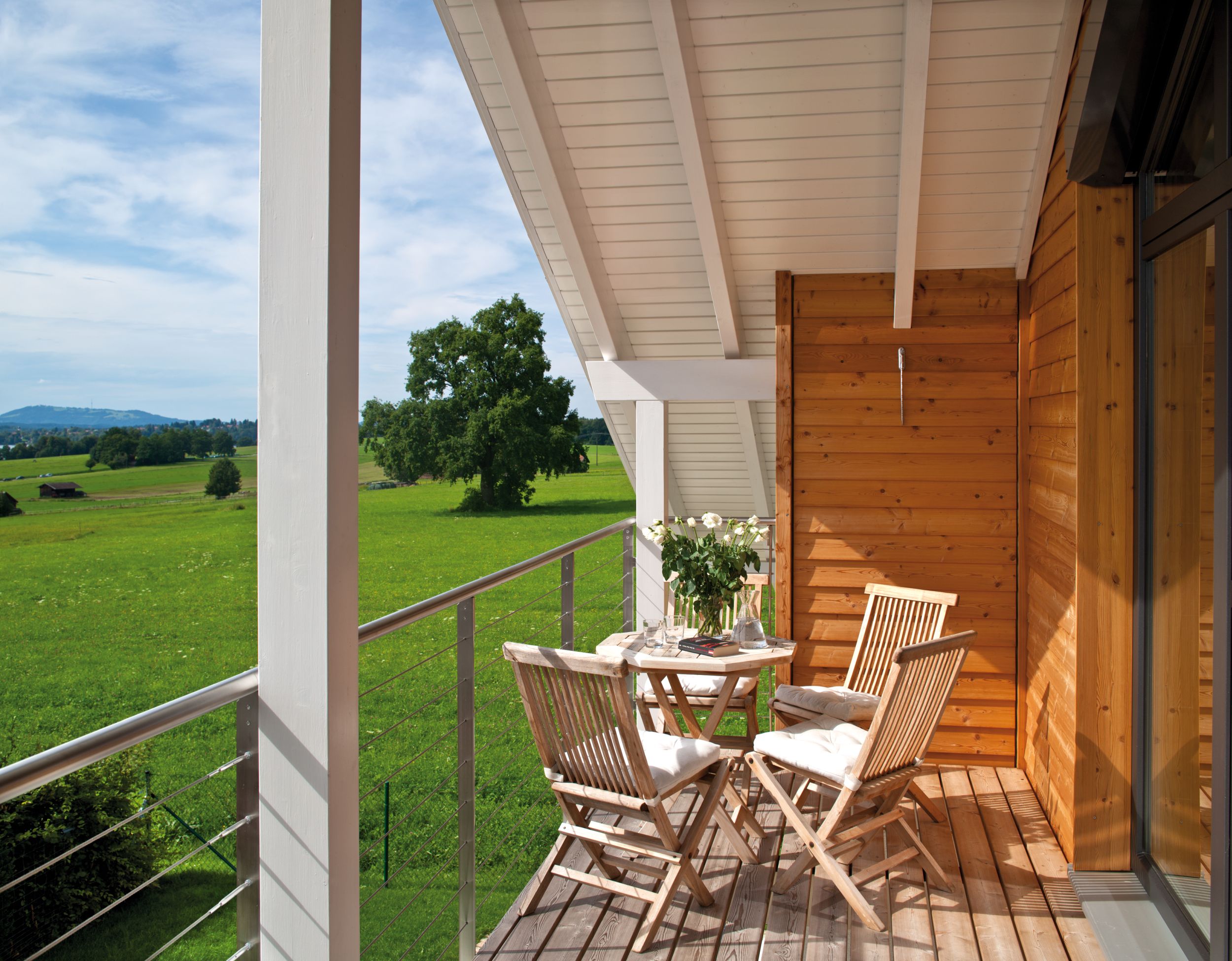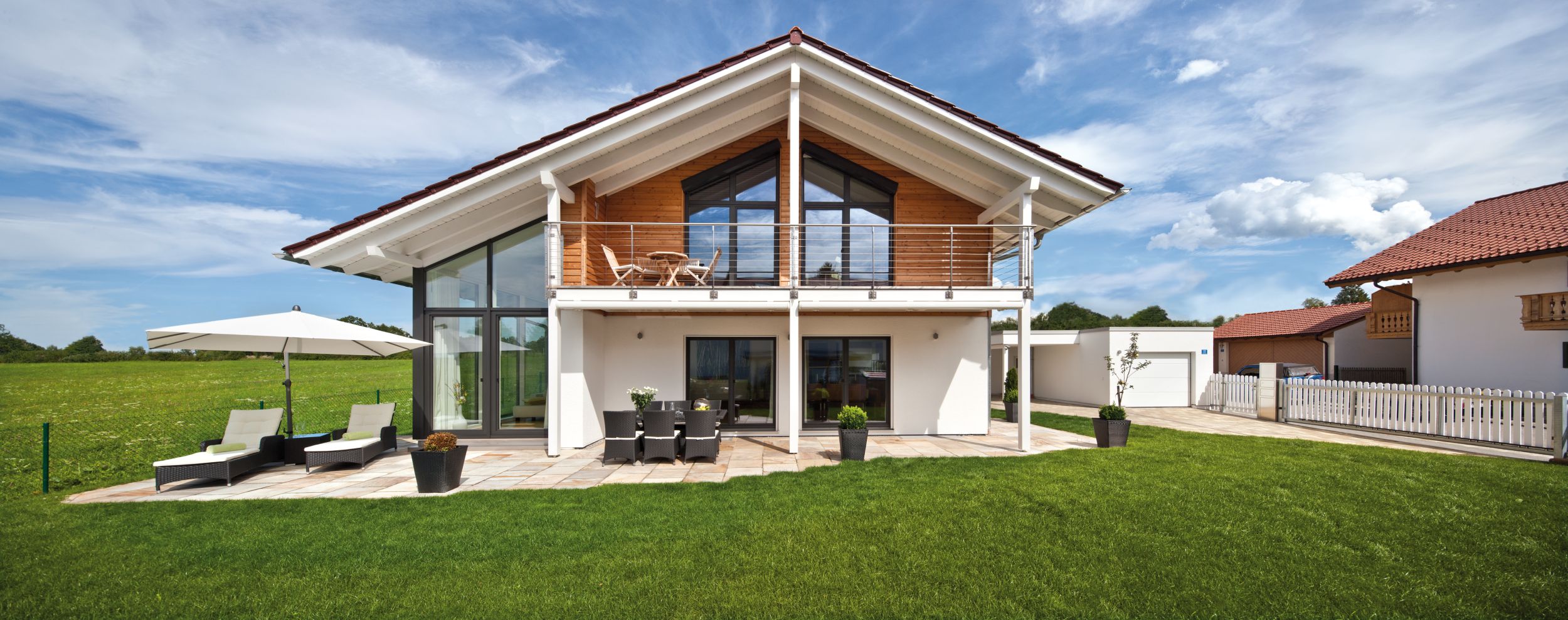 Raum für die Natur - Regnauer setzte dieses Ziel in einem individuell geplanten Architektenhaus mit einer elegant-schlichten Gestaltung zur Straße und einer dominanten Glasfassade zum Gartengrundstück mit anschließender Wiese um. Wohltuend: die offenen, großzügigen Wohnräume, die bei der Bauherrenfamilie durch die großen Glasflächen von besonders viel Licht durchflutet werden und das Haus in die Landschaft des Voralpenlandes hinaus zu verlängern scheinen. Aus der Natur stammt auch der Baustoff Holz, den die Fassade im Obergeschoss mit einer waagerechten Schalung aufnimmt. Im Innern schaffen Holzböden den Bogen zum Baustoff. Den Ton gibt die Farbe Weiß an – außen durch Strukturputz an der Erdgeschossfassade und durch weiß gestrichene Sichtbalken, innen durch weiße Wände, Decken und Einbauschränke. Details wie eine geschwungene Wendeltreppe in Anthrazit und Edelstahlelemente ziehen die Blicke auf sich.