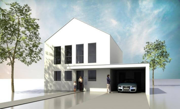 Mit seinem zur Straßenfront giebelständigen Spitzdach vereint das Haus Zwei die traditionelle Hausform harmonisch mit einem modernen Inhalt. Die schnörkellose Linienführung gibt dem Modell eine zeitlose Eleganz.
