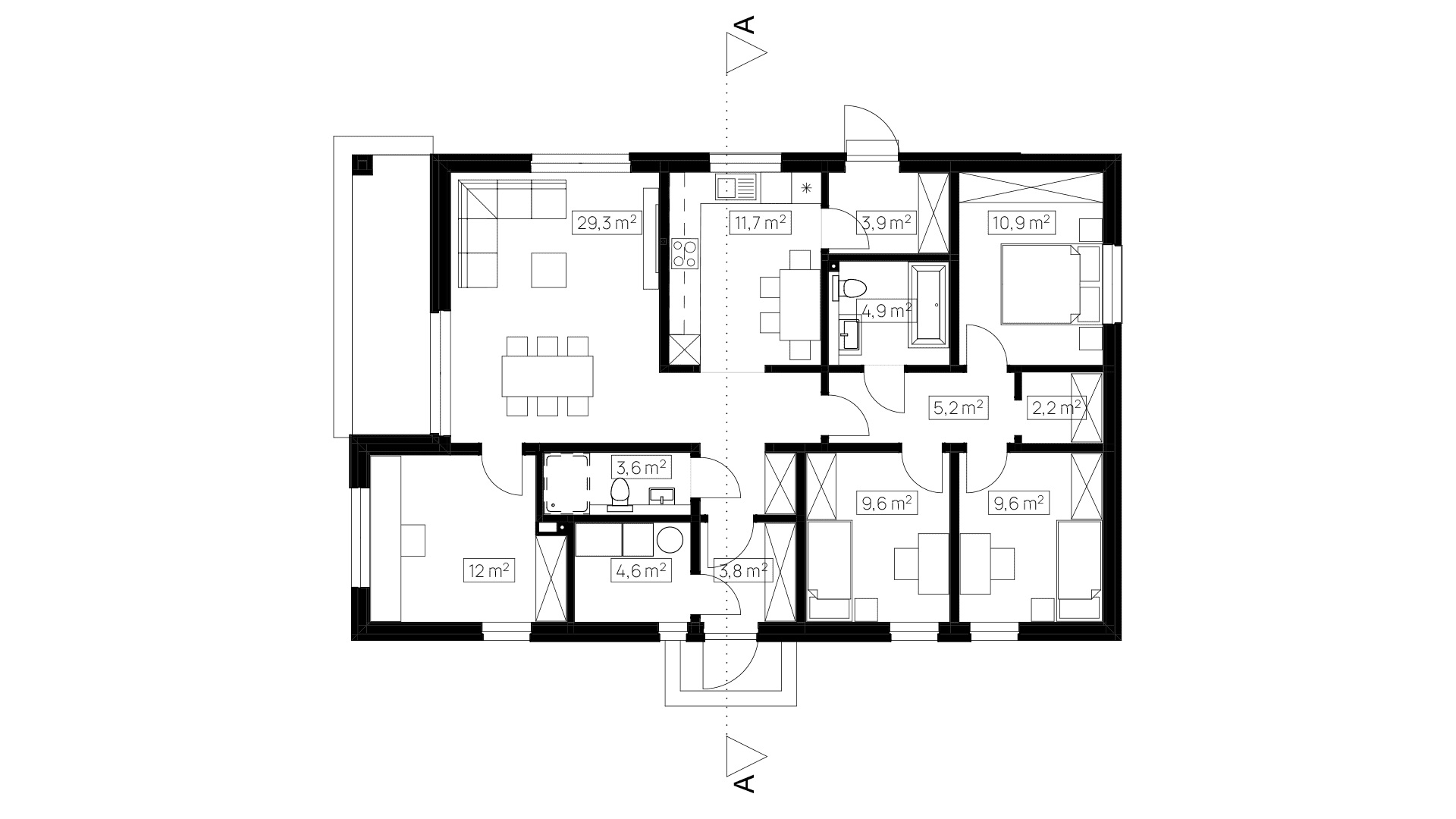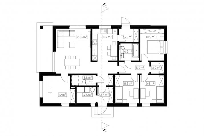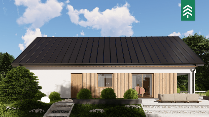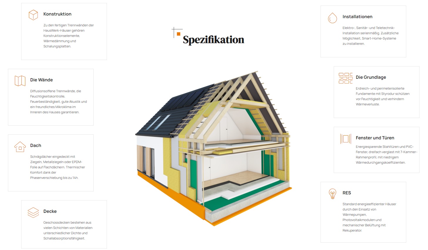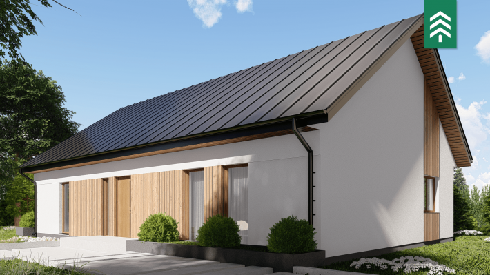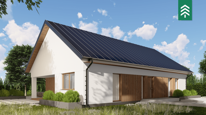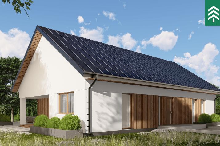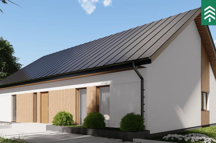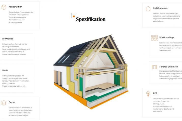 Zu den fertigen Trennwänden der HausWerk-Häuser gehören Konstruktionselemente, Wärmedämmung und Schalungsplatten. Die Wärmedämmung macht fast 80 % der Dicke der Außenwand aus, was sich in einer hohen Energieeffizienz und den besten Standards der Wärmeübertragung niederschlägt: U = 0,10-0,14 W / m²K. Schrägdächer eingedeckt mit Ziegeln, Metallziegeln oder EPDM-Folie auf Flachdächern. Thermischer Komfort dank der Phasenverschiebung bis zu 14h. Standard energieeffizienter Häuser durch den Einsatz von Wärmepumpen, Photovoltaikmodulen und mechanischer Belüftung mit Rekuperator.