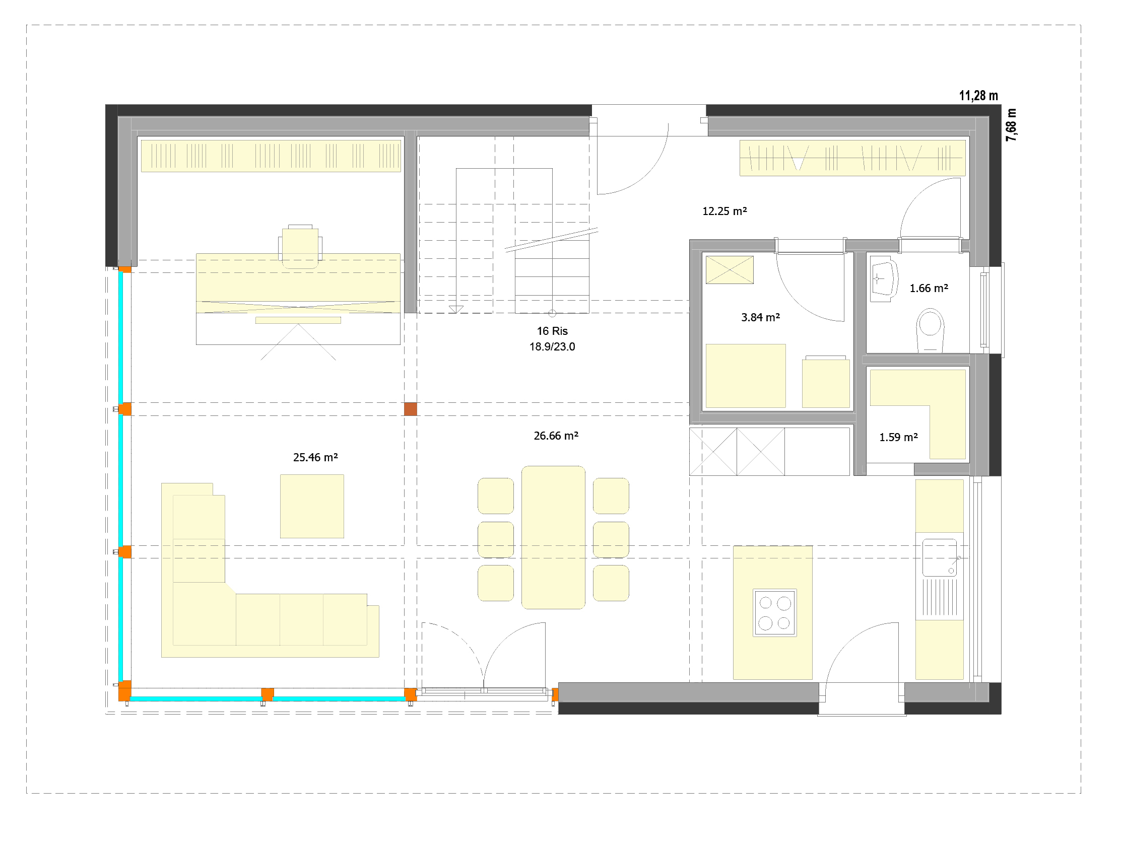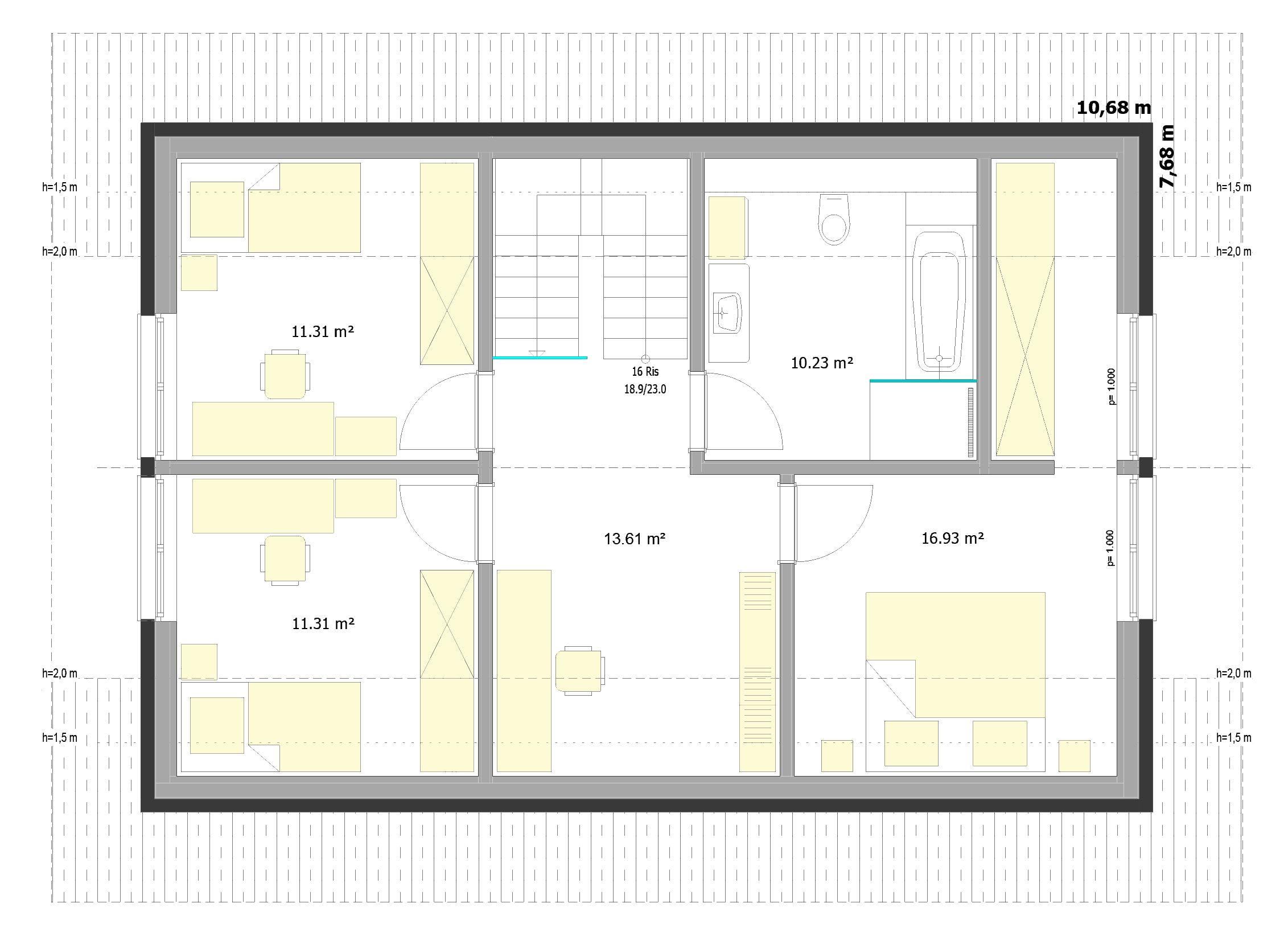 Installationsebene an allen Außenwänden.