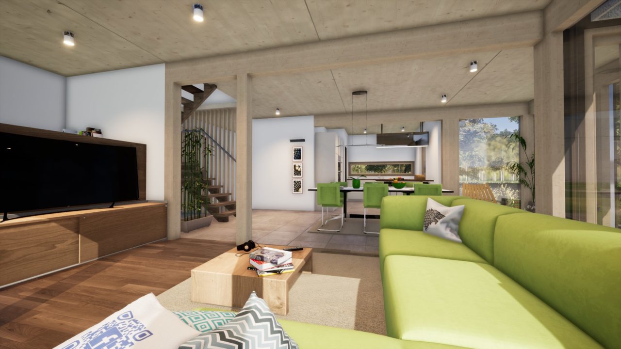 Der Treffpunkt der Familie ist der einladende Wohnbereich im Erdgeschoß mit einer Vielzahl von Einrichtungsmöglichkeiten.