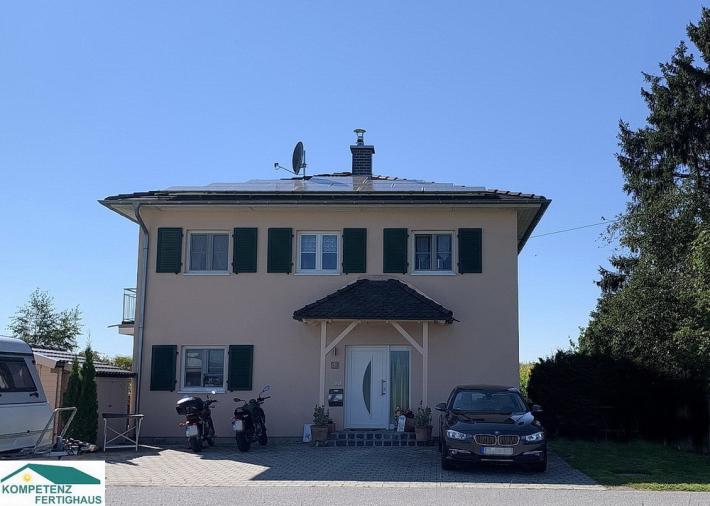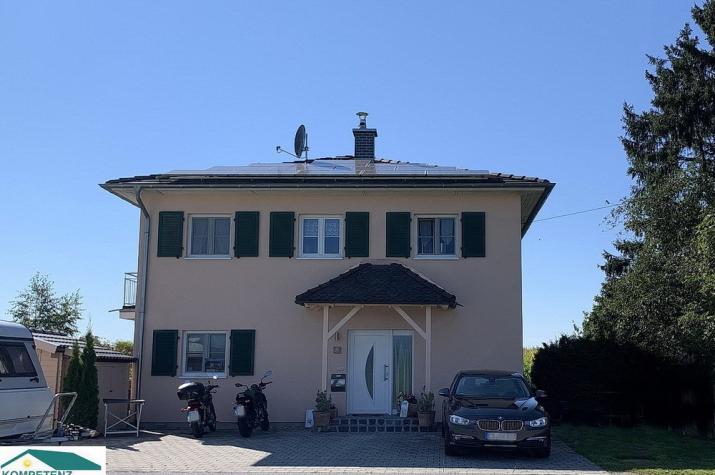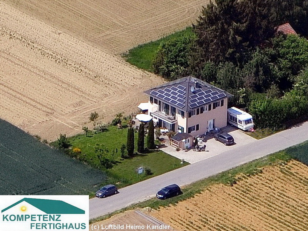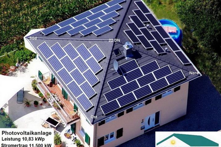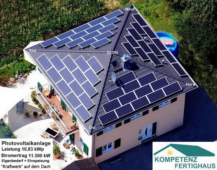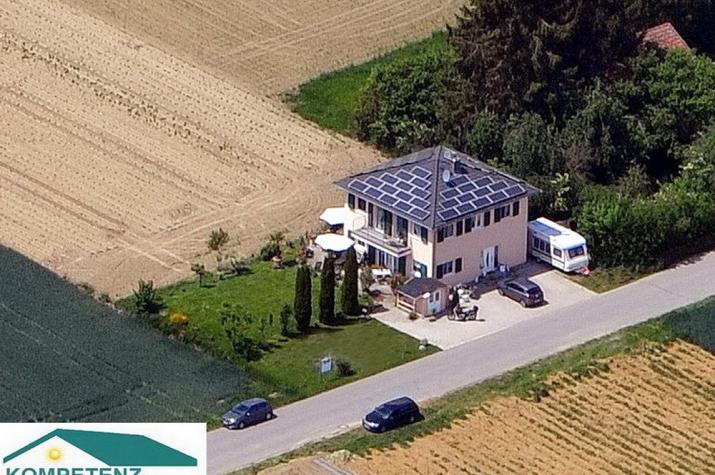 In absolut freier Planung erstelltes Effizienzhaus mit Walmdach, zwei Vollgeschoßen und absolut autarker Energieversorgung mit Strom durch PV-Anlage auf allen vier Dachseiten (Leistung 10,83 kW/p