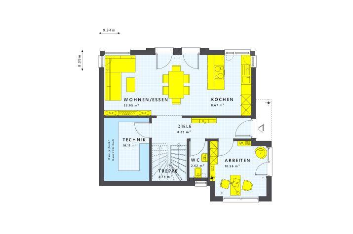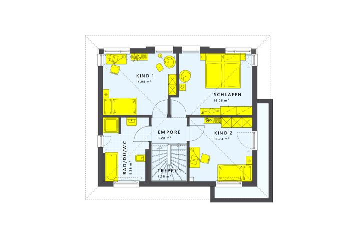 SUNSHINE 125 macht in verschiedenen Architekturvarianten vom pfiffigen Satteldachhaus bis zur zweigeschossigen Stadtvilla eine prima Figur. Im offenen Koch-Ess-Wohnbereich wird gelebt und gelacht – und ganz sicher fühlen sich hier auch deine Gäste rundherum wohl. Viel Freiraum für die persönliche Lebensart bietet in dem tollen Familienhaus auch das obere Geschoss. Die Eltern gönnen sich ein Schlafzimmer mit separater Ankleide und Wellness-Bad. Oder zwei Kinder genießen hier ihr eigenes Reich zum Spielen, Lernen und Schlafen. Bestimmt wird es dir gefallen, mit vielfältigen Architektur-Accessoires dein ganz persönliches Eigenheim zu gestalten.