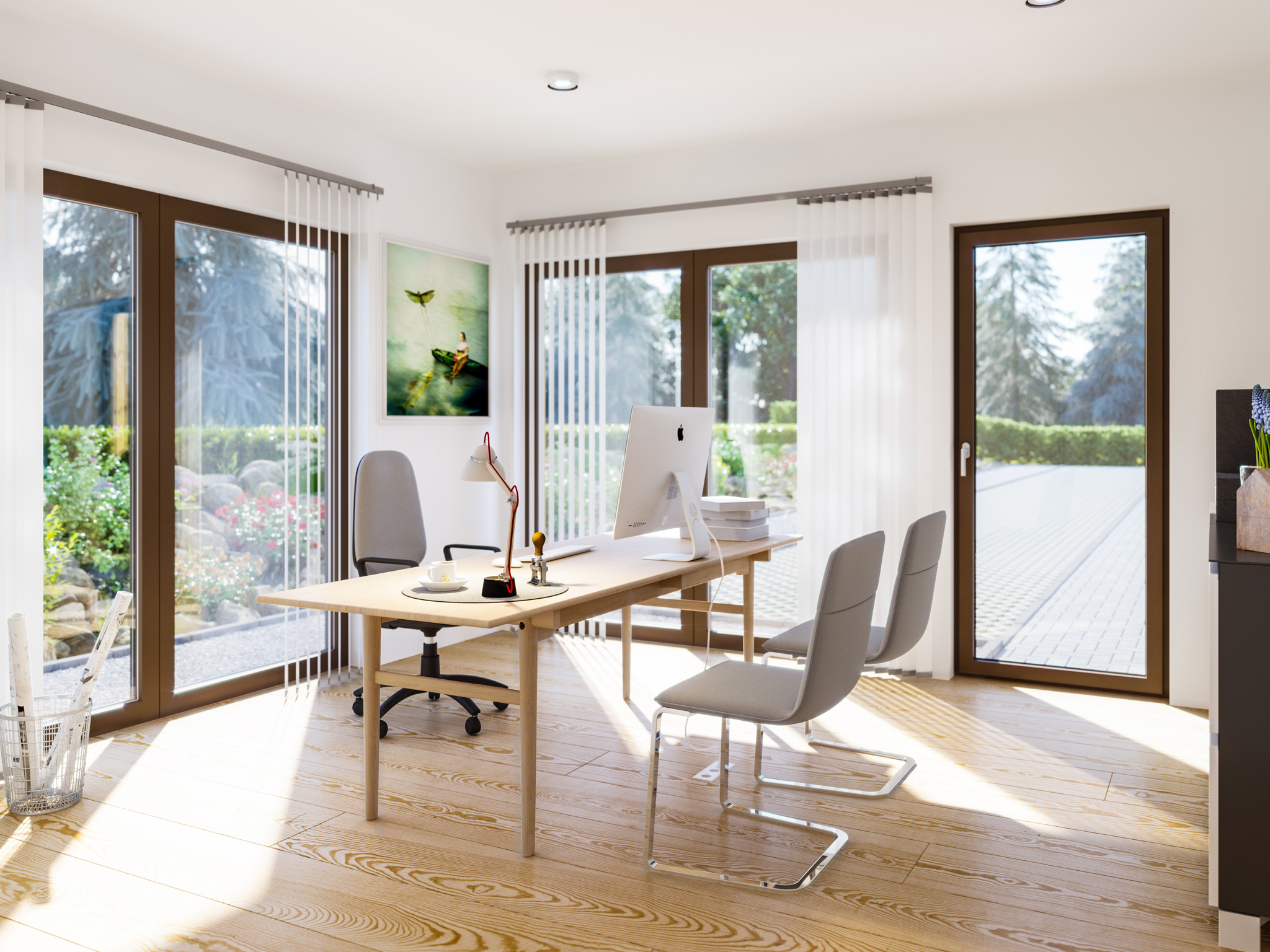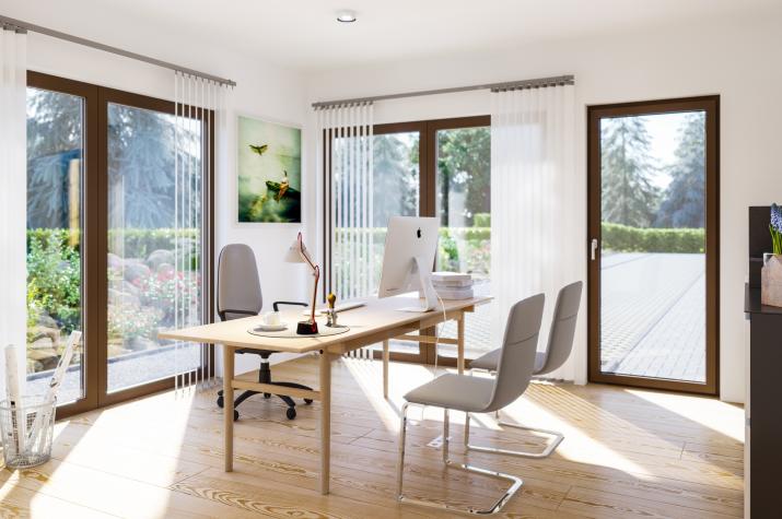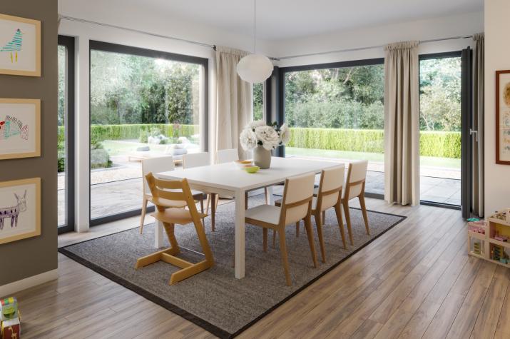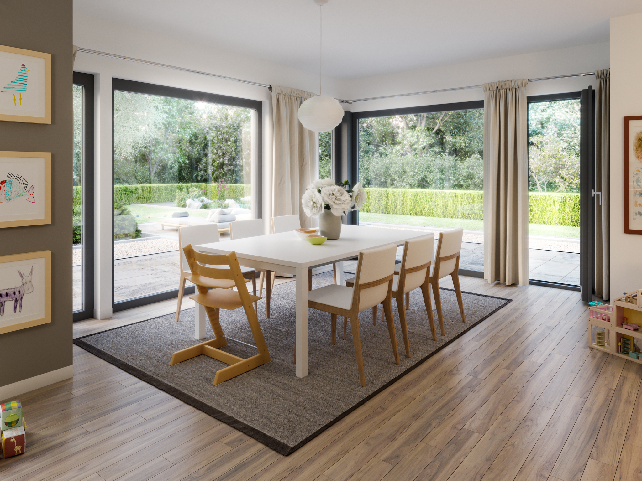 Der einzigartige Grundriss mit geradläufiger Innentreppe sowie einem modernen und großzügigen Raumprogramm macht das SUNSHINE 144 zu einem ganz besonderen Eigenheim – zum perfekten Haus für deine ganze Familie. Das herrlich große Wohnzimmer geht fließend ins Esszimmer über und bietet nicht nur genug Platz für eine Sofalandschaft, sondern auch für deine antike Kommode, dein selbst geschreinertes Weinregal oder eine kuschelige Spielecke. Auch der Rest des Hauses lässt keine Wünsche offen – dank zahlreicher individueller Gestaltungsmöglichkeiten.