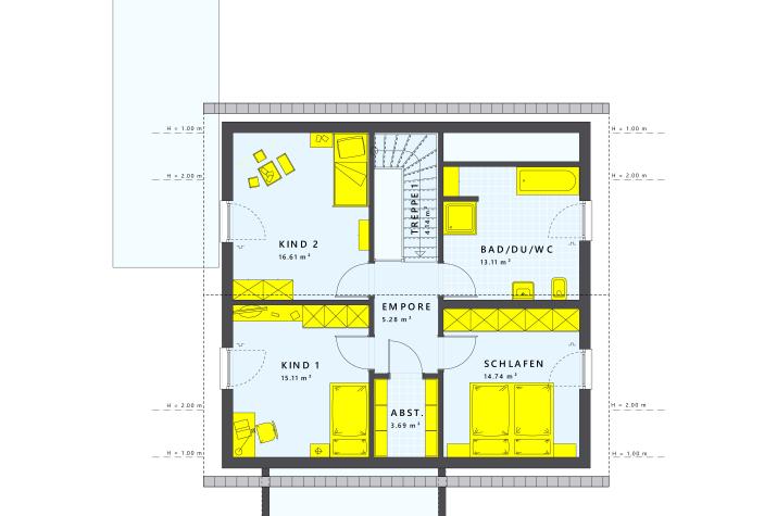 Das SUNSHINE 151 bietet dir die perfekten Lösungen für die unterschiedlichsten Wohnanforderungen. Wenn ihr gerne länger ausgeht oder mit Freunden öfters die Nacht zum Tag macht – am Ende des Tages geht ihr im Erdgeschoss zu Bett, und die Kinder können oben unterm Dach ruhig schlafen. Das Gästezimmer neben den Kinderzimmern lässt sich auch als zusätzliches Spielzimmer nutzen, das das Kinderreich perfekt ergänzt. Dank seiner vier unterschiedlichen Obergeschoss-Varianten eignet sich dieses Haus für große Familien genauso wie für kleine. So könnt ihr auswählen, ob alle Familienmitglieder ihre Schlafzimmer im Obergeschoss haben oder ob ein Teil der Familie unten und der andere oben in bis zu fünf Schlafzimmern wohnt.